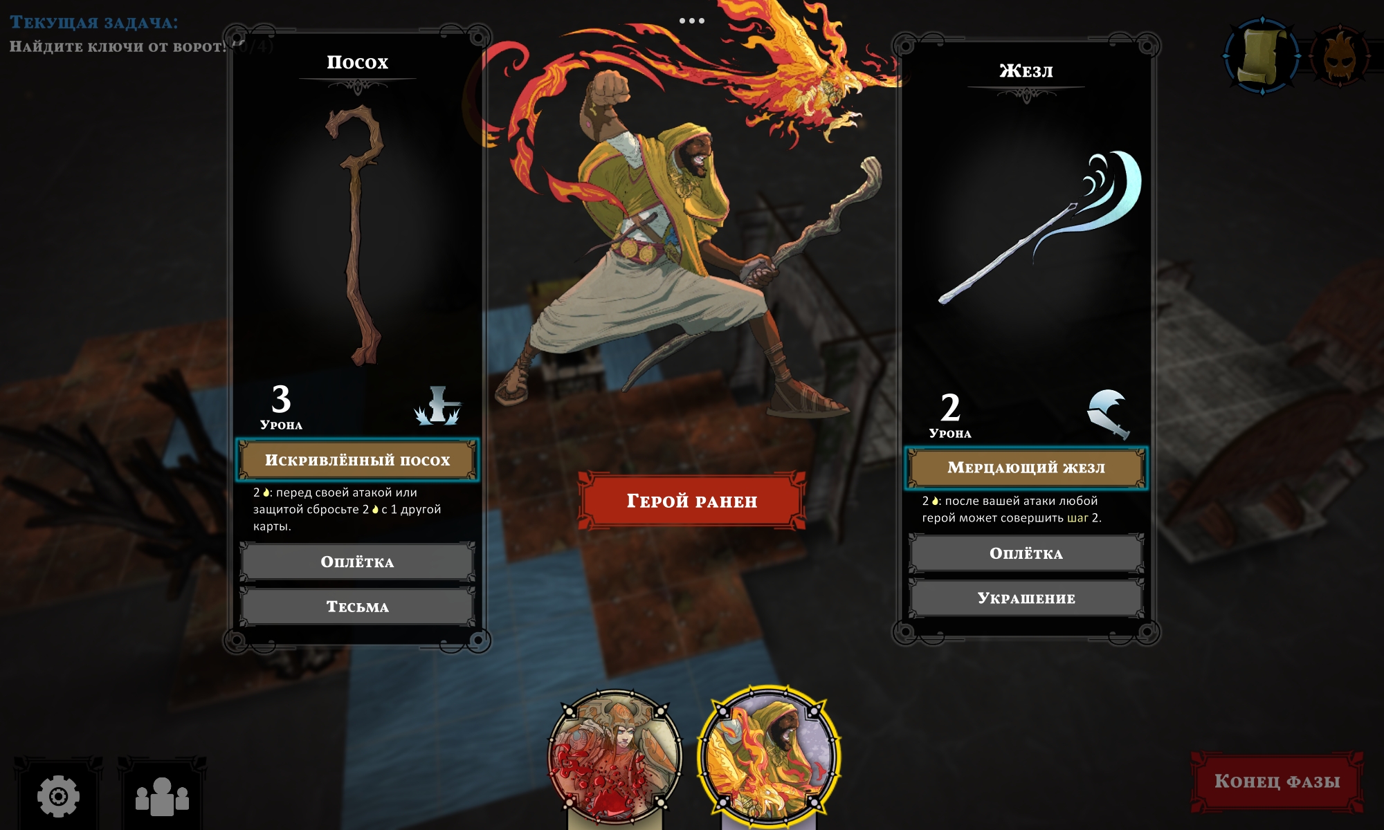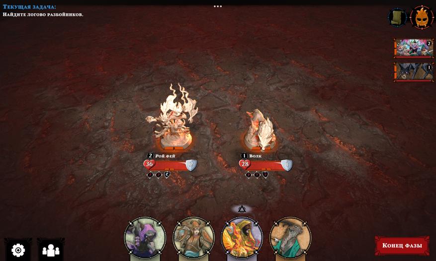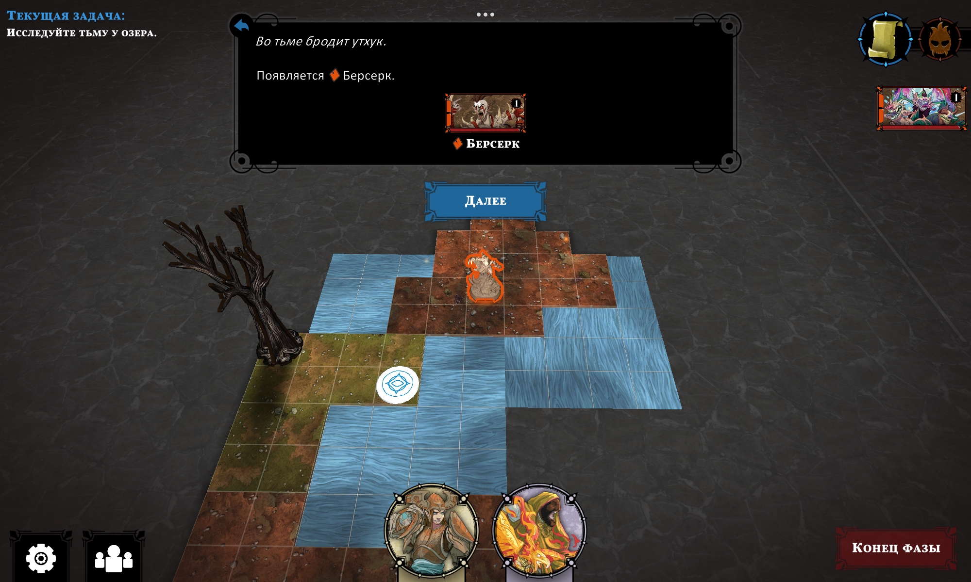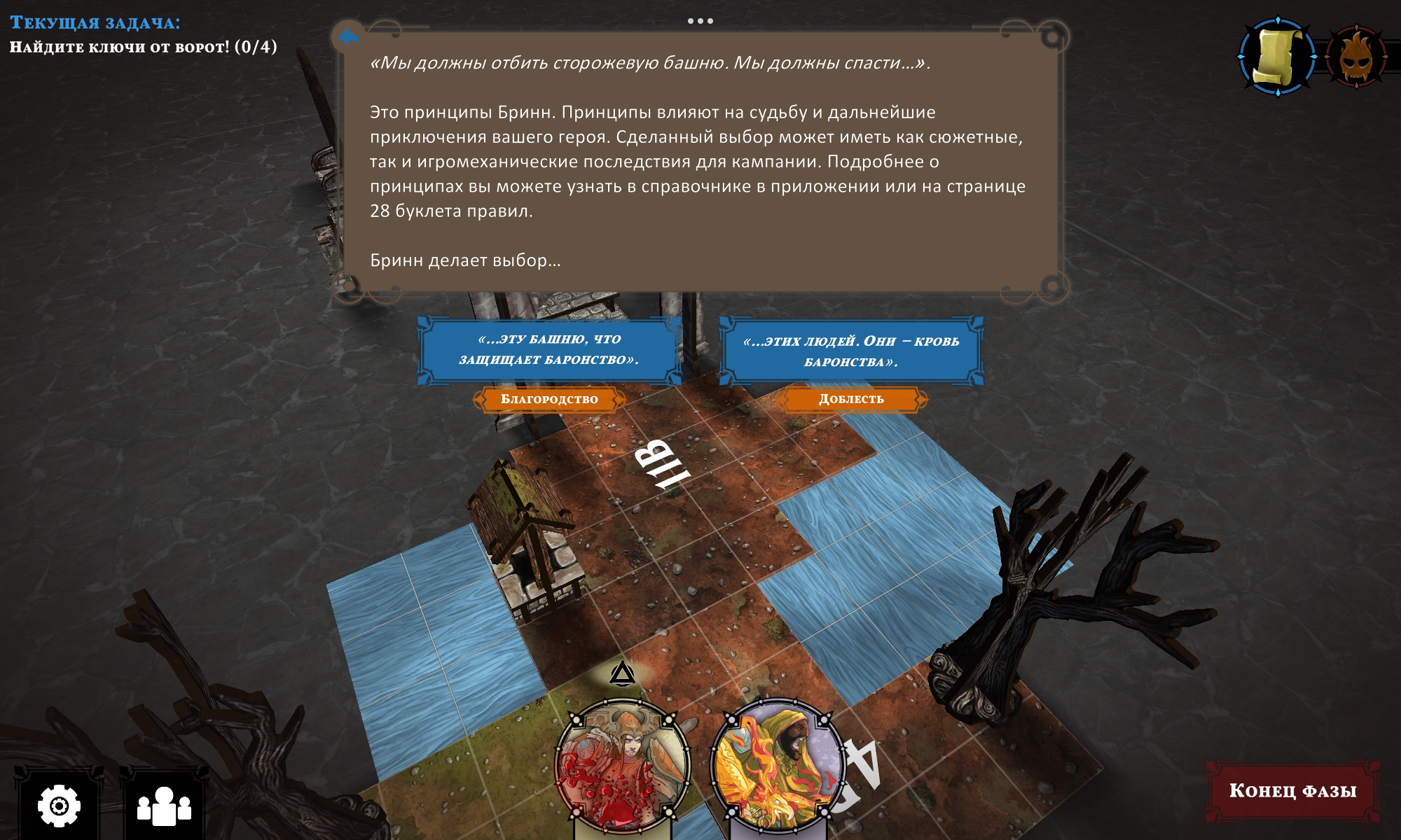 После того как все враги сходили, приложение, если требуется по сценарию, рассказывает о происходящих событиях, размещает новых противников на поле и обновляет задачи героев. Некоторые враги могут замышлять что-то хитрое или мощное, тогда выдается небольшая подсказка на этот счет. Затем снова наступает фаза героев.