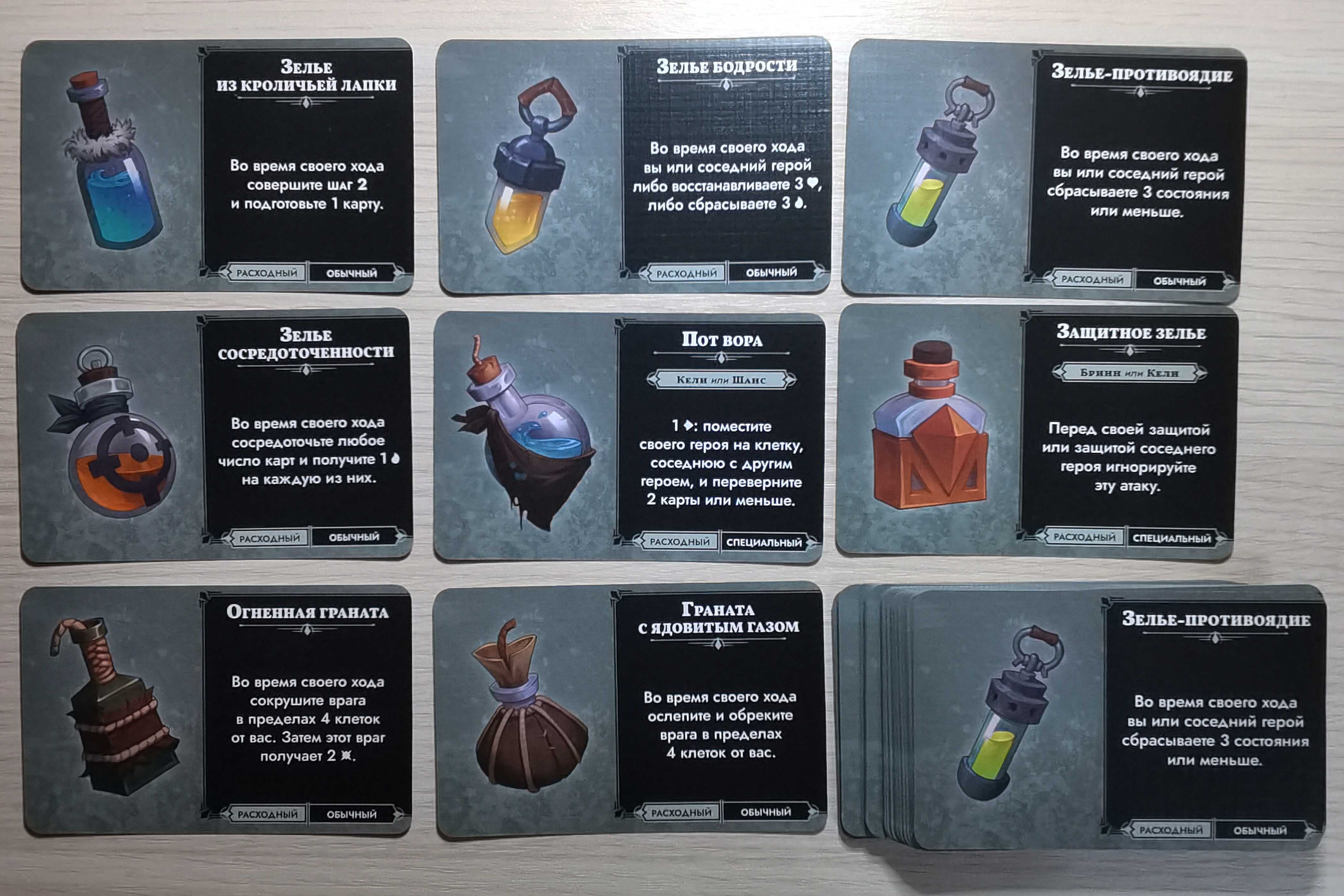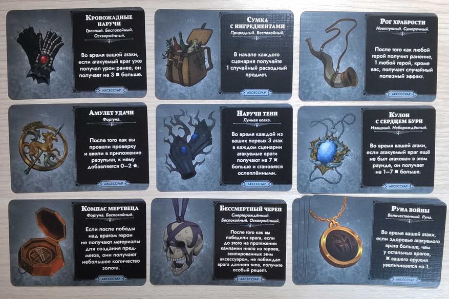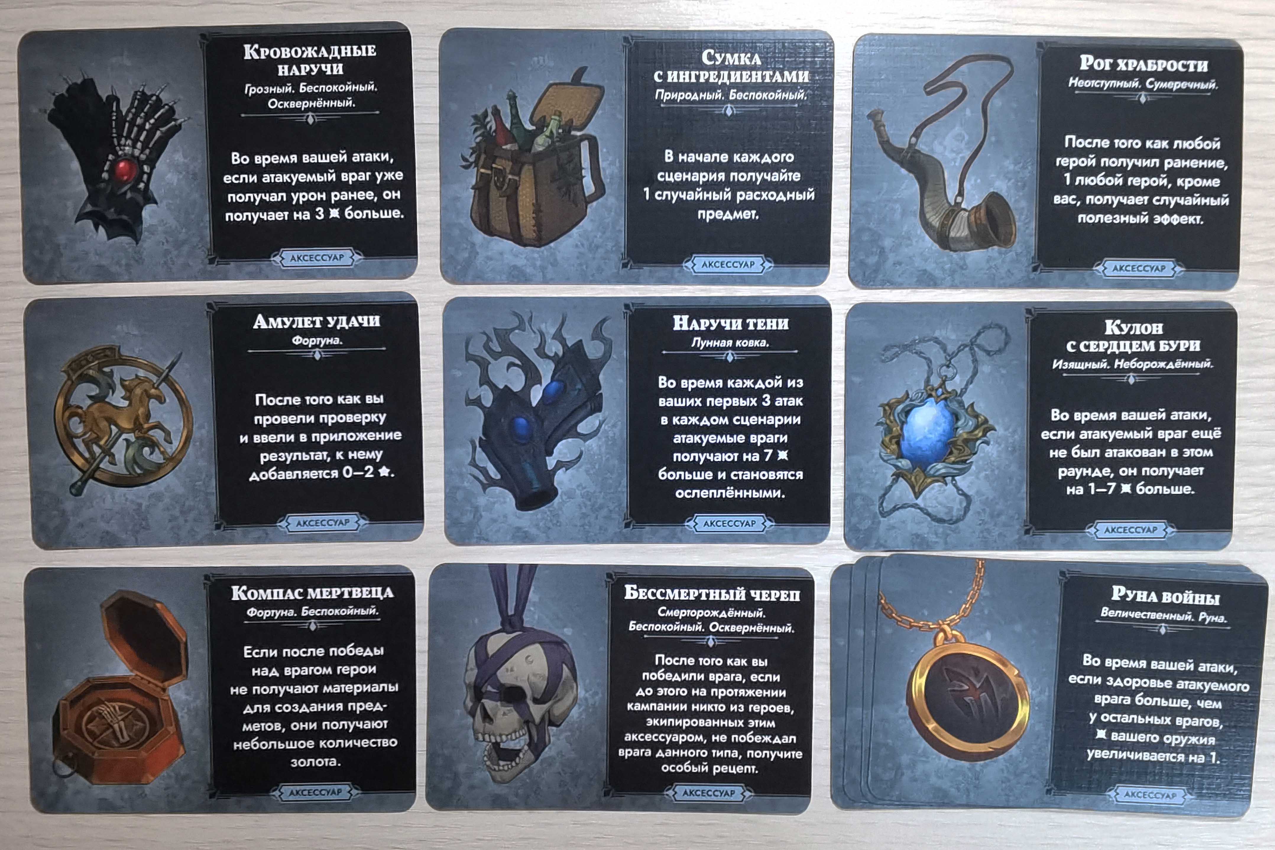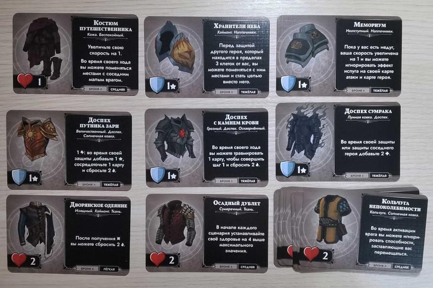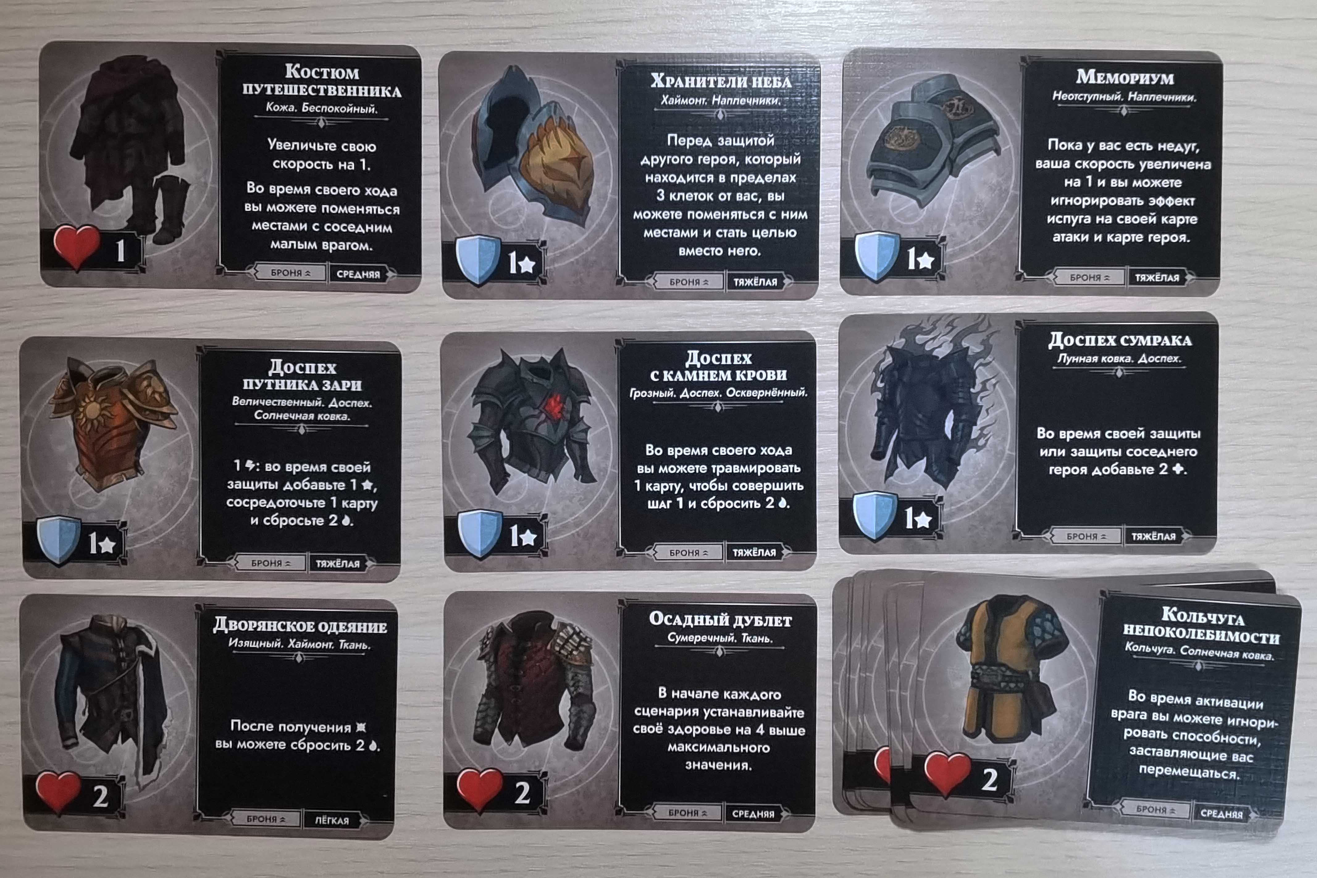 - карты (57x89 мм): 40 оружия, 18 брони, 12 аксессуаров, 42 расходных предмета, 42 навыка, 10 недугов;
