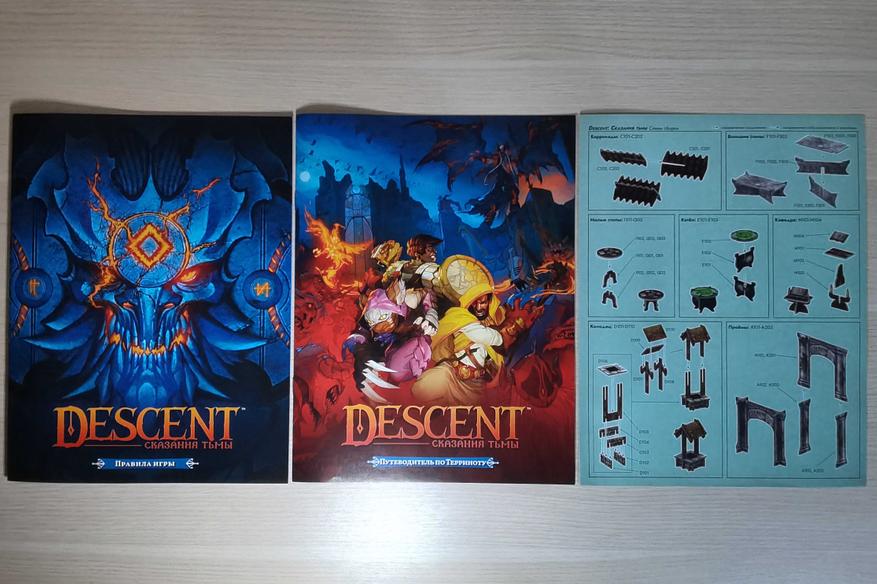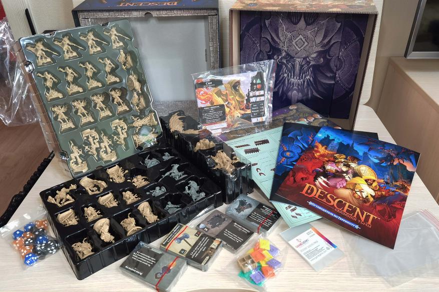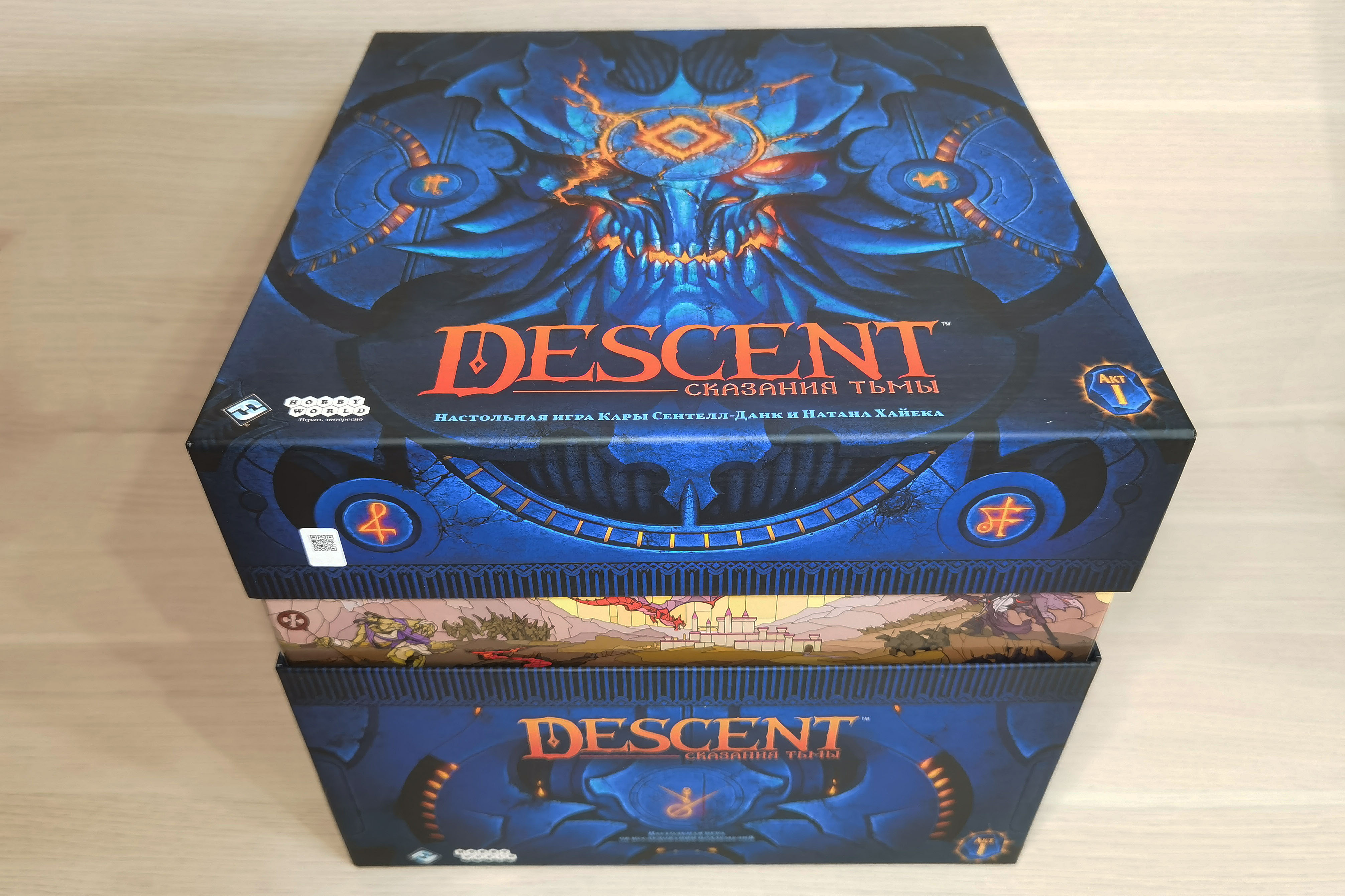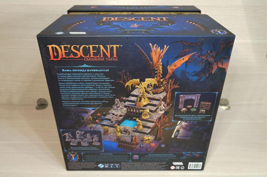 «Descent: Сказания тьмы» поставляется в довольно эпичной коробке размерами 298x298x262 мм и весом 3.9 кг, украшенной зловещей драконьей головой. После распаковки выясняется, что она разделена на две части, причем нижняя пустая. Предназначена она для размещения игровых декораций, которые вначале предстоит собрать из плоских элементов. Хотя часть контента перенесена в приложение, комплект поставки тут более чем богатый:
