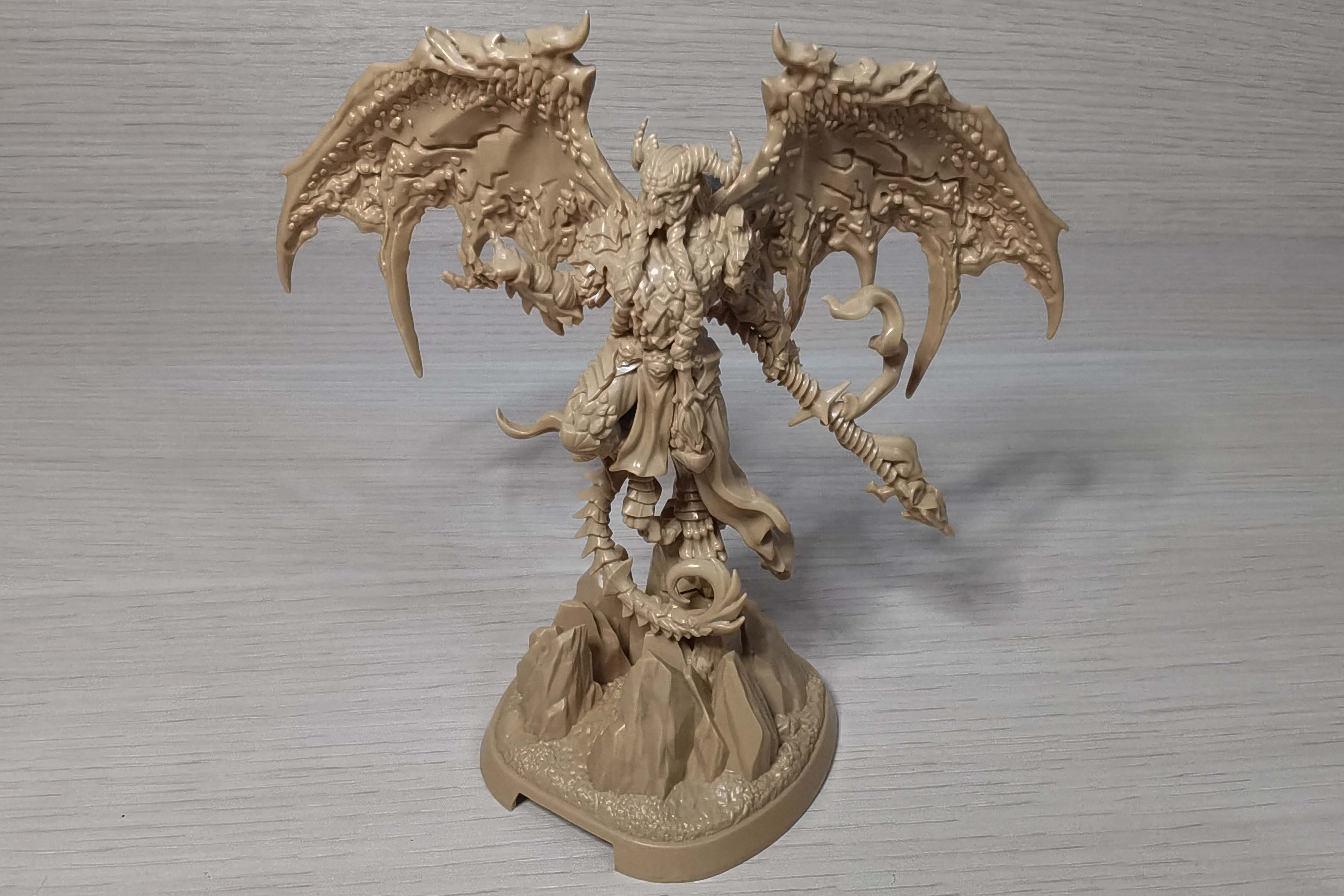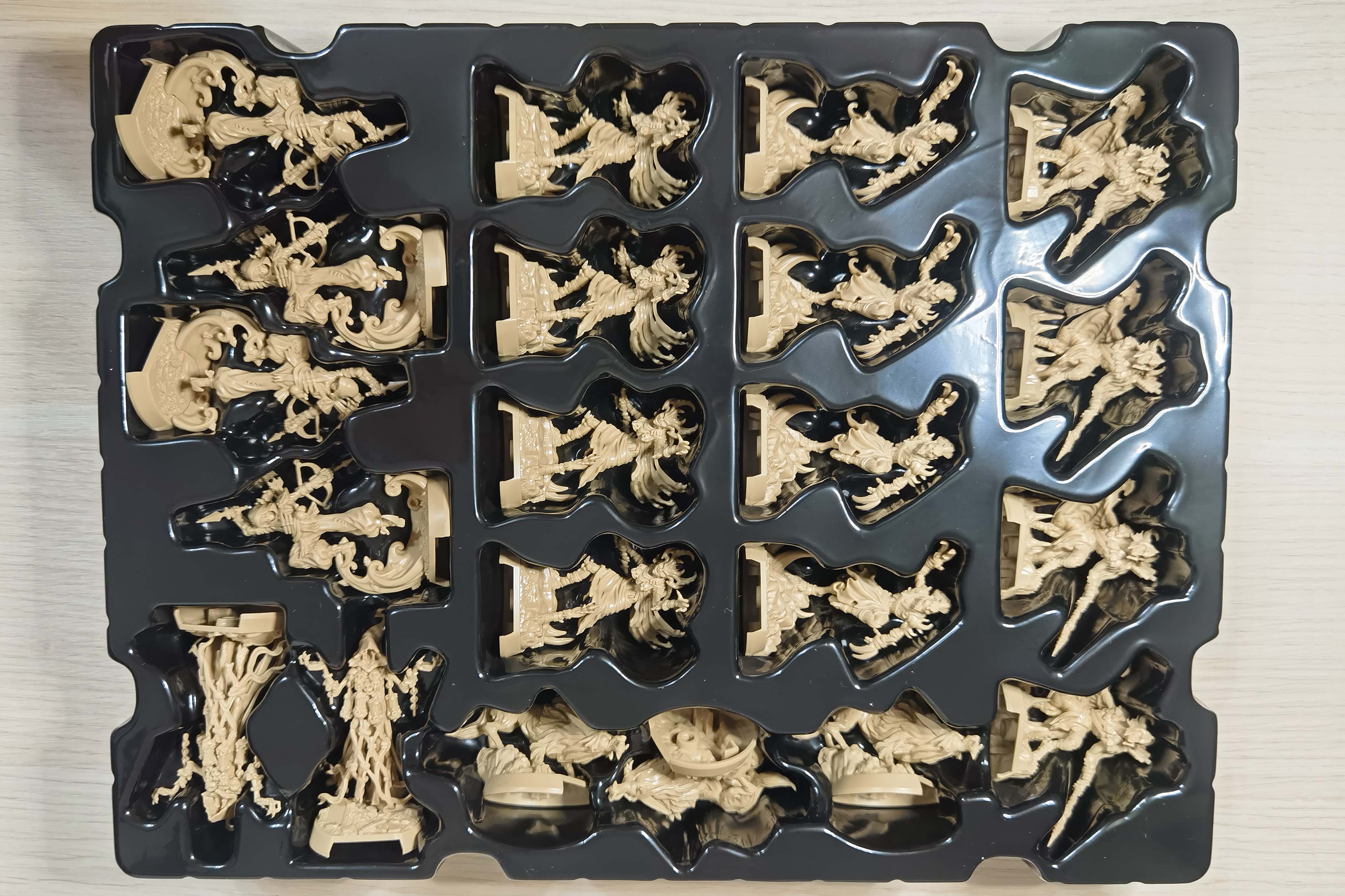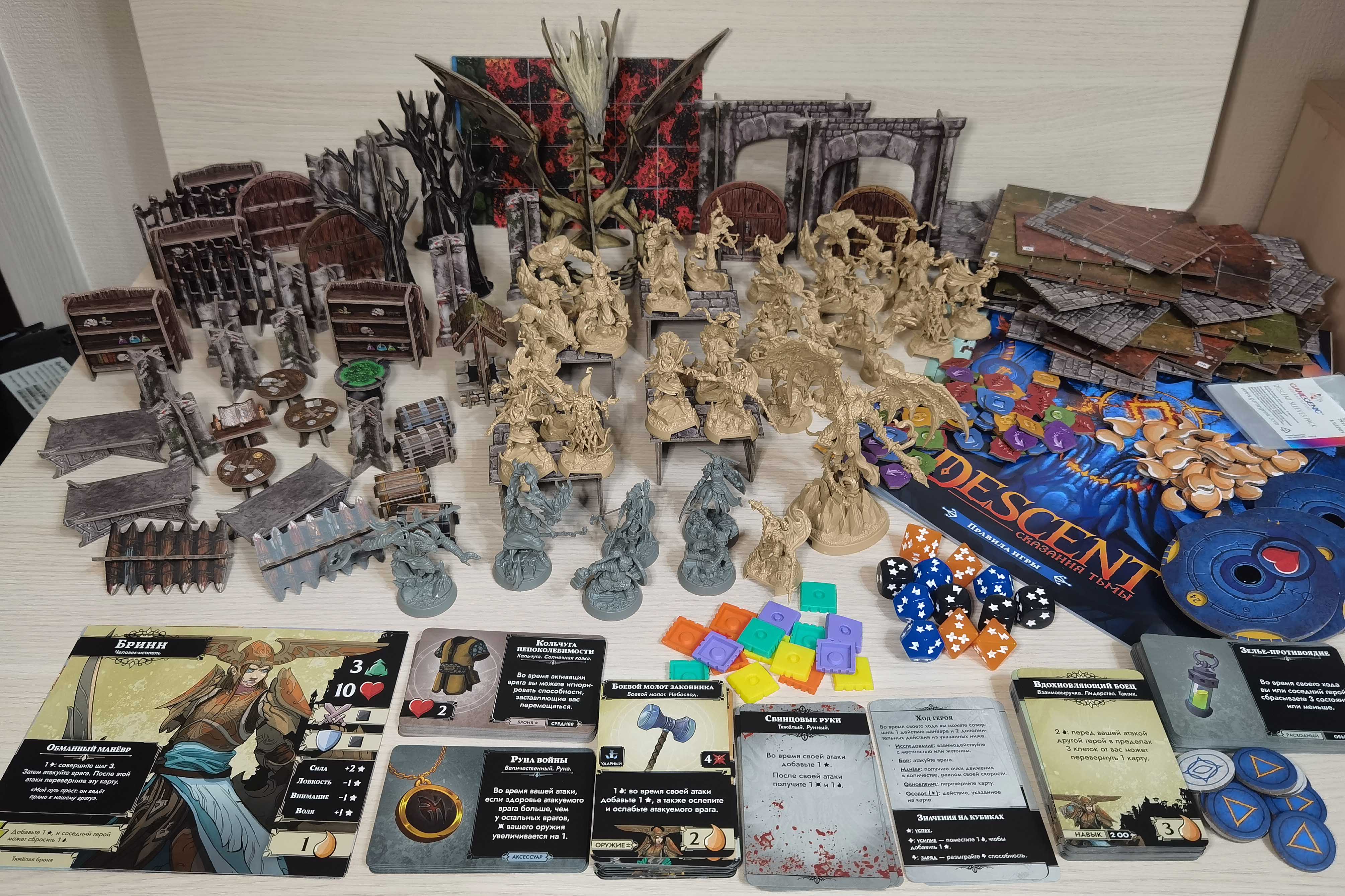 «Descent: Сказания тьмы» поставляется в довольно эпичной коробке размерами 298x298x262 мм и весом 3.9 кг, украшенной зловещей драконьей головой. После распаковки выясняется, что она разделена на две части, причем нижняя пустая. Предназначена она для размещения игровых декораций, которые вначале предстоит собрать из плоских элементов. Хотя часть контента перенесена в приложение, комплект поставки тут более чем богатый: