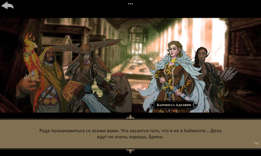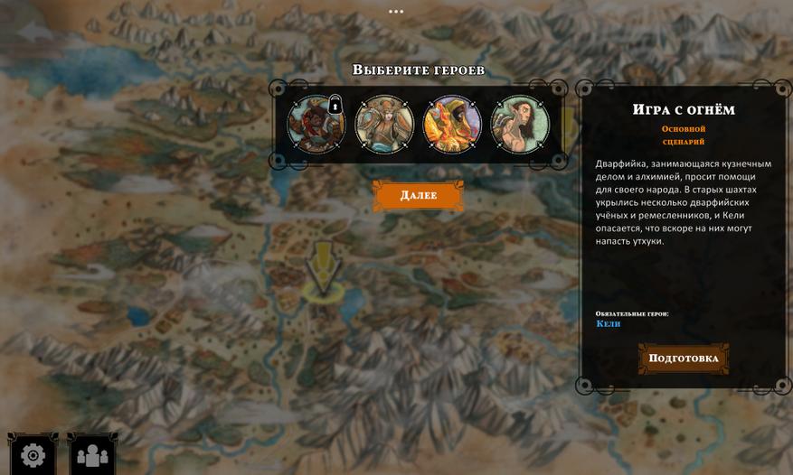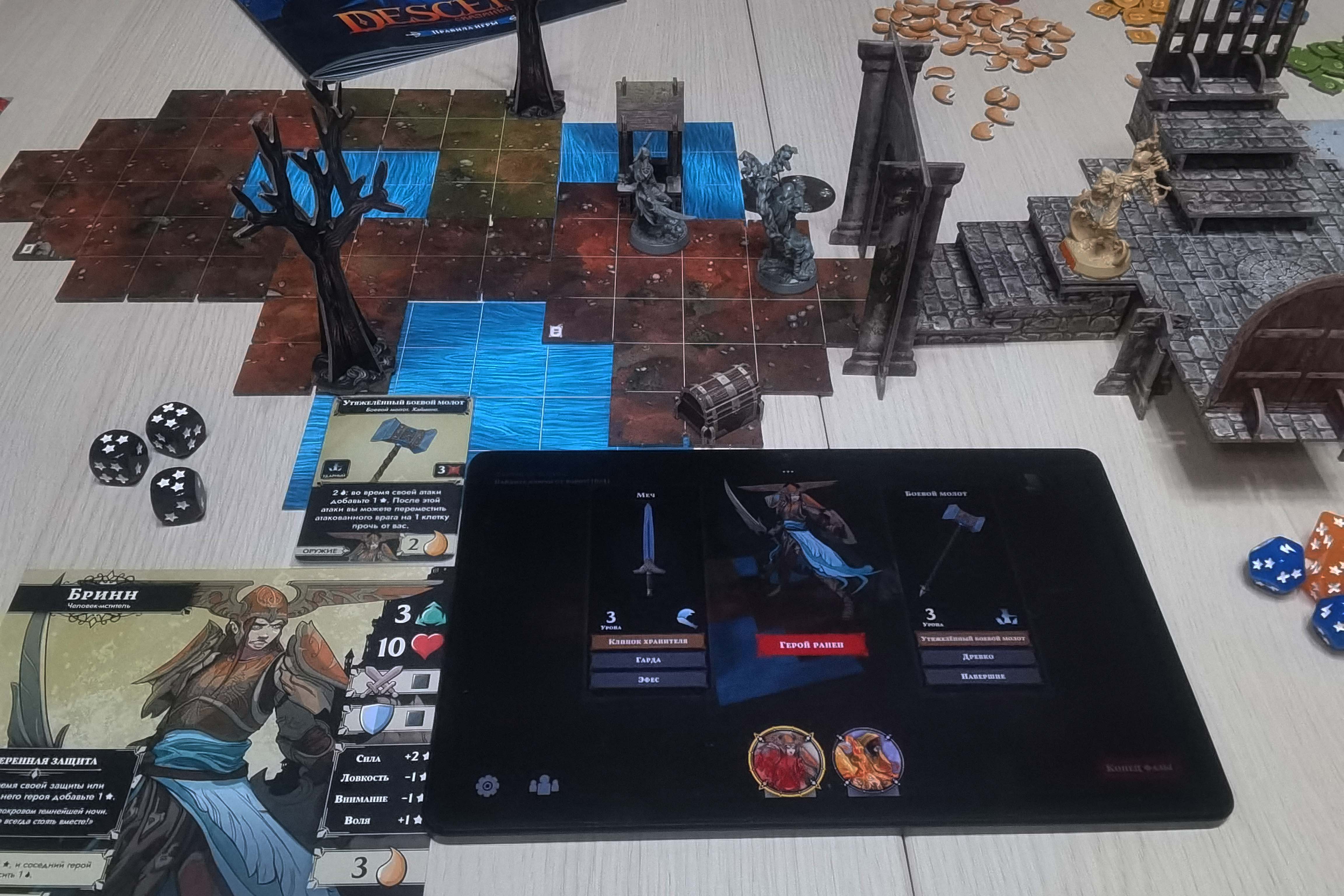 Следующим шагом следует скачать и установить бесплатное приложение Descent: Legends of the Dark, которое доступно для iOS, Android и Windows (Steam). Будьте готовы подождать — программа довольно долго обновляется. Настоятельно не рекомендую пользоваться смартфоном — лучше использовать планшет на подставке, ноутбук или даже телевизор, чтобы информация оставалась в поле зрения всех участников. Часть реплик персонажей озвучены, присутствуют видеовставки и весьма атмосферная музыка.