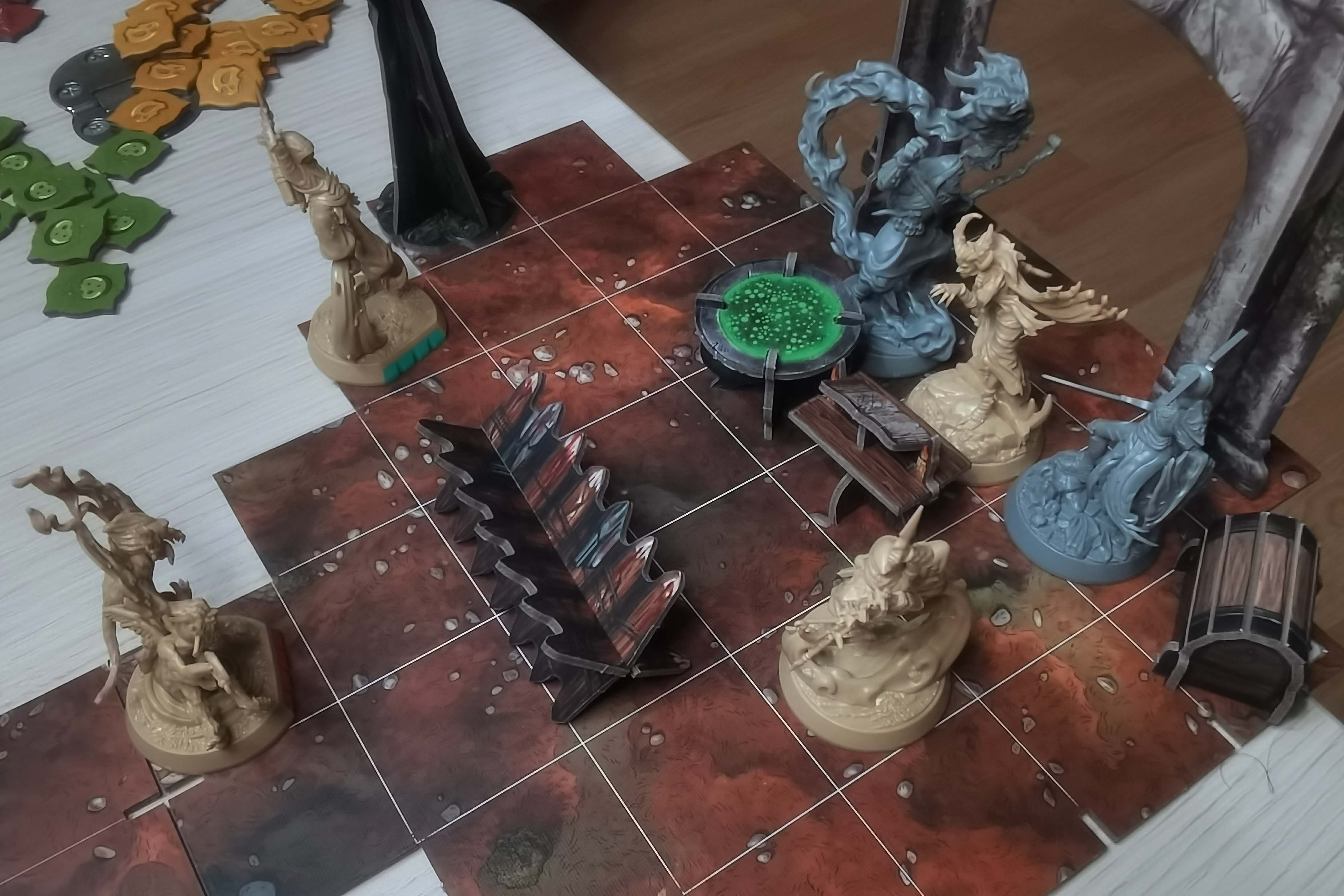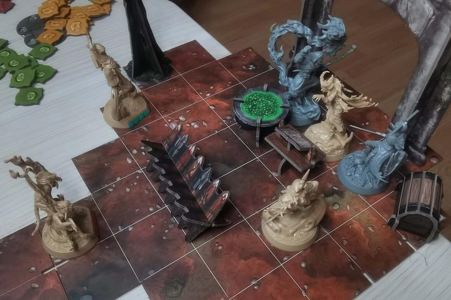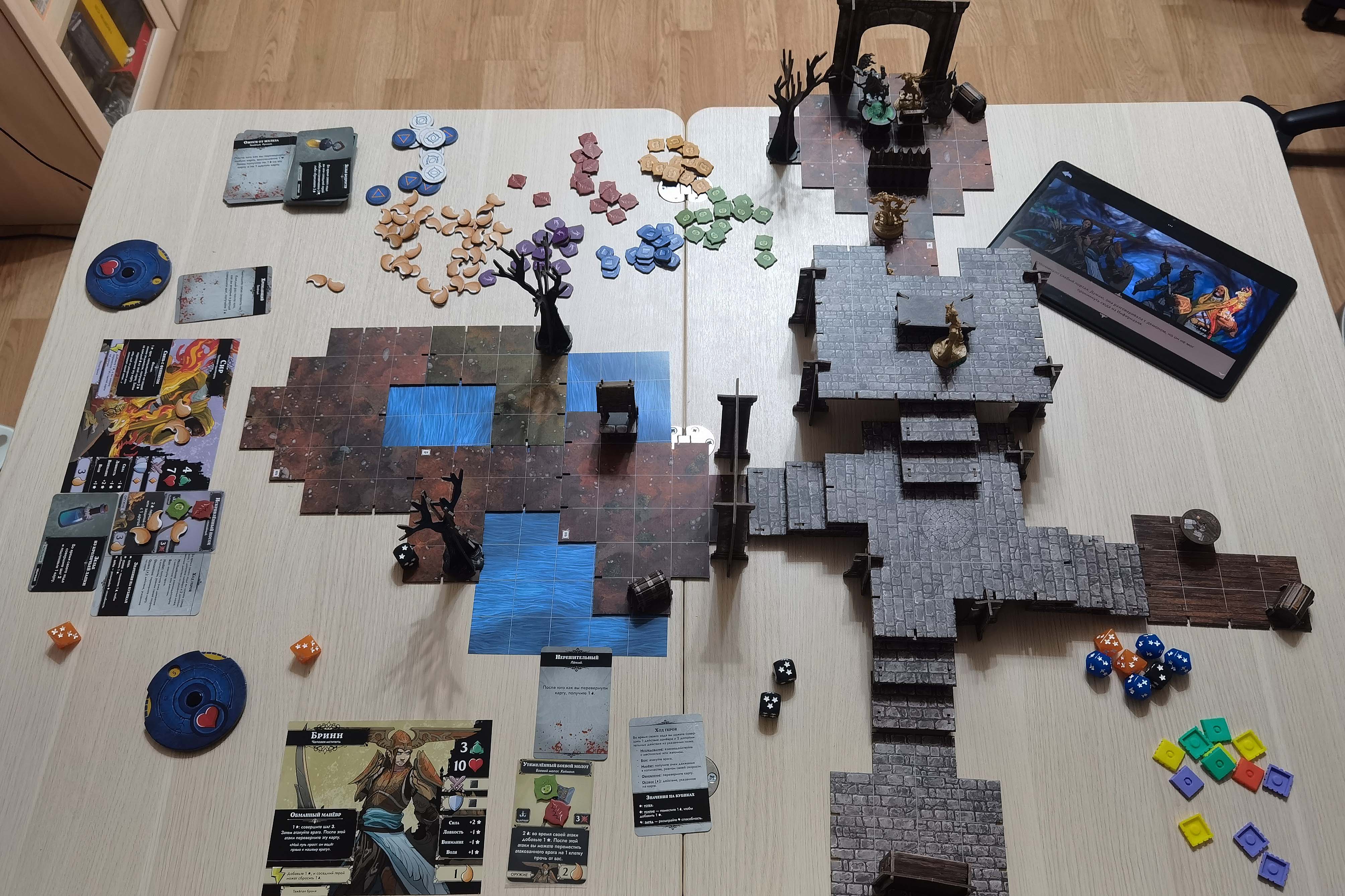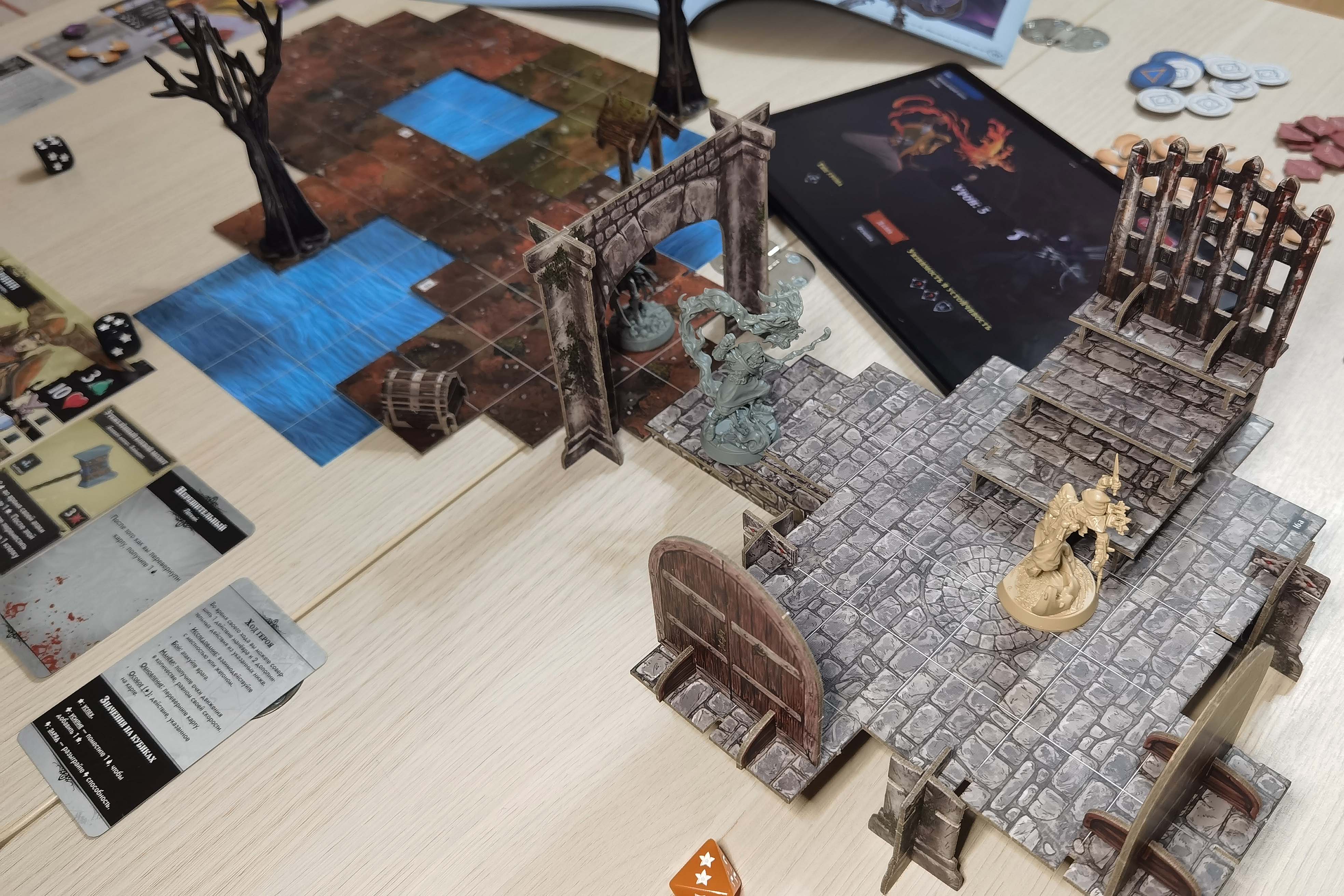 Наконец, понадобится большой стол — локации тут весьма масштабные. Под рукой следует держать запас жетонов, карты расходных предметов и недугов, элементы окружения, фрагменты поля, подложки и фигурки врагов.