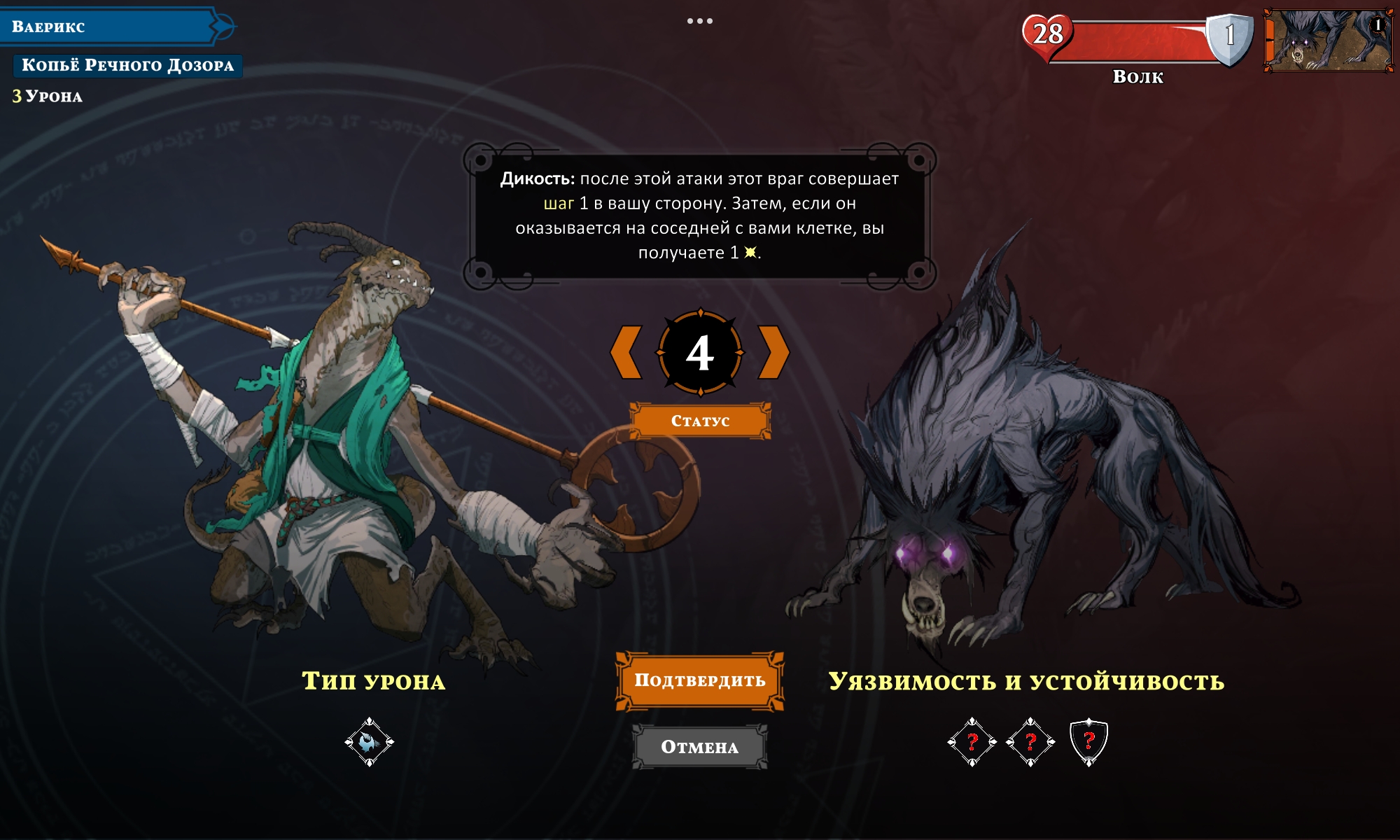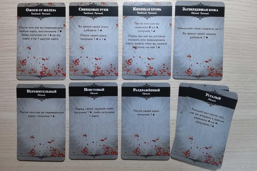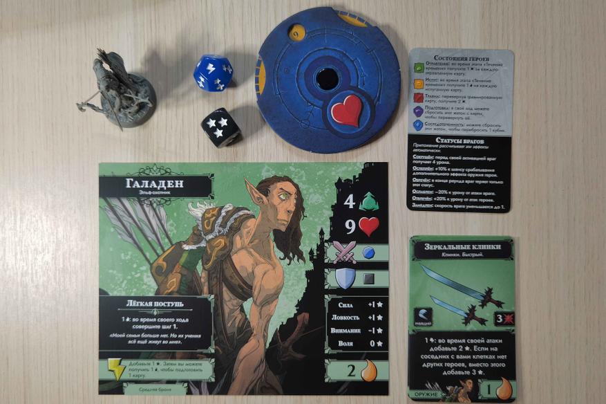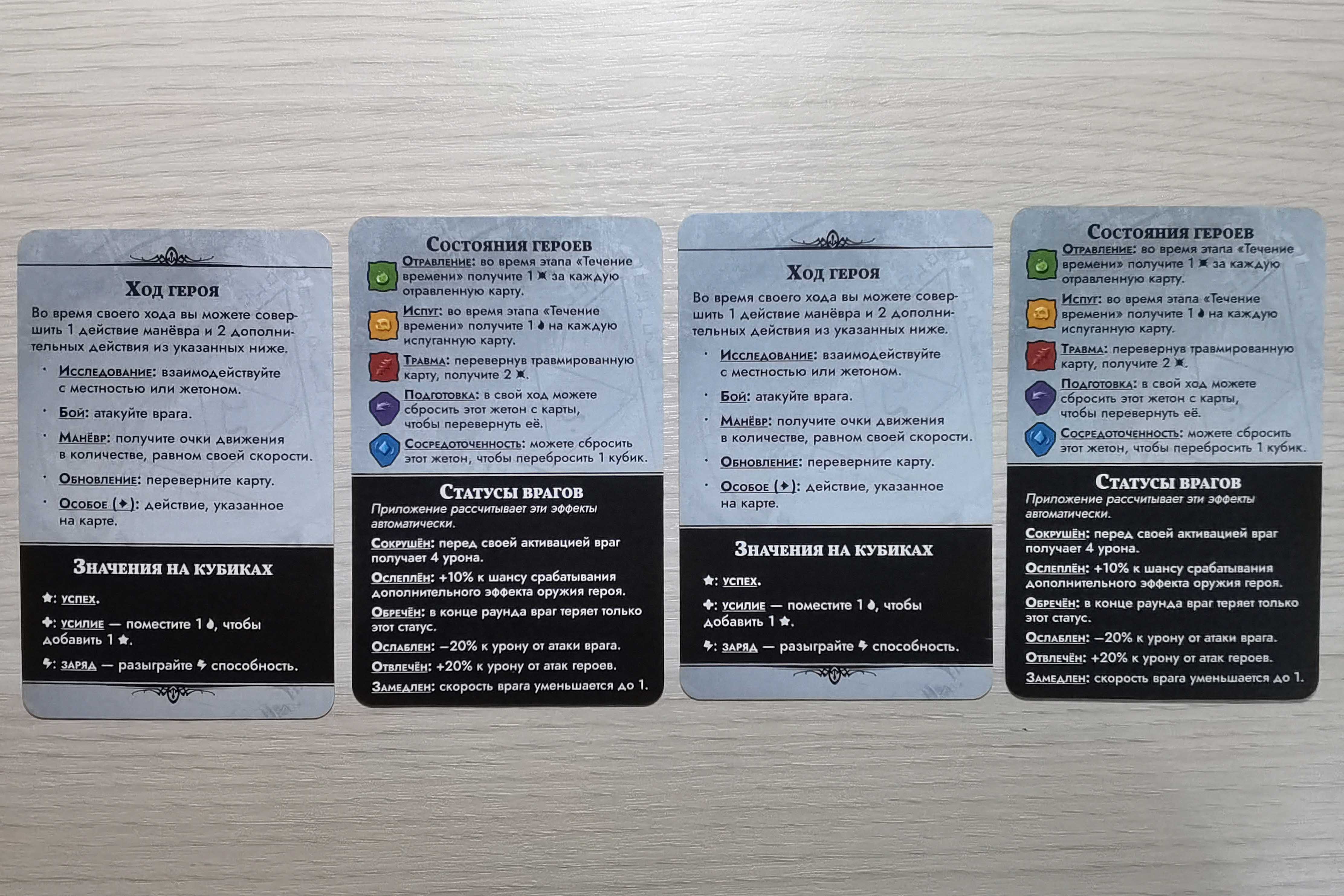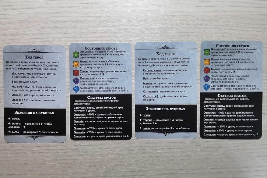 Перечисленные карты также могут находиться под различными эффектами, которые обозначаются соответствующими жетонами. За каждое отравление герой получает по 1 урону в ход, а за испуг — по 1 жетону истощения, сосредоточение дает возможность перебросить один дайс, а подготовка — бесплатно перевернуть карту, травма же заставляет персонажа получить 2 повреждения при перевороте. Все эти фишки также удаляются с карты при ее перевороте. Противники тоже могут получать особые статусы, но они отмечаются игроками в приложении и действуют всего один ход: сокрушен — враг получает 4 урона при своей активации, ослеплен — шанс срабатывания особых способностей героя увеличивается на 10%, обречен — остальные статусы сохраняются еще на ход, ослаблен — урон снижен на 20%, отвлечен — получает на 20% больше повреждений, замедлен — скорость снижается до 1.