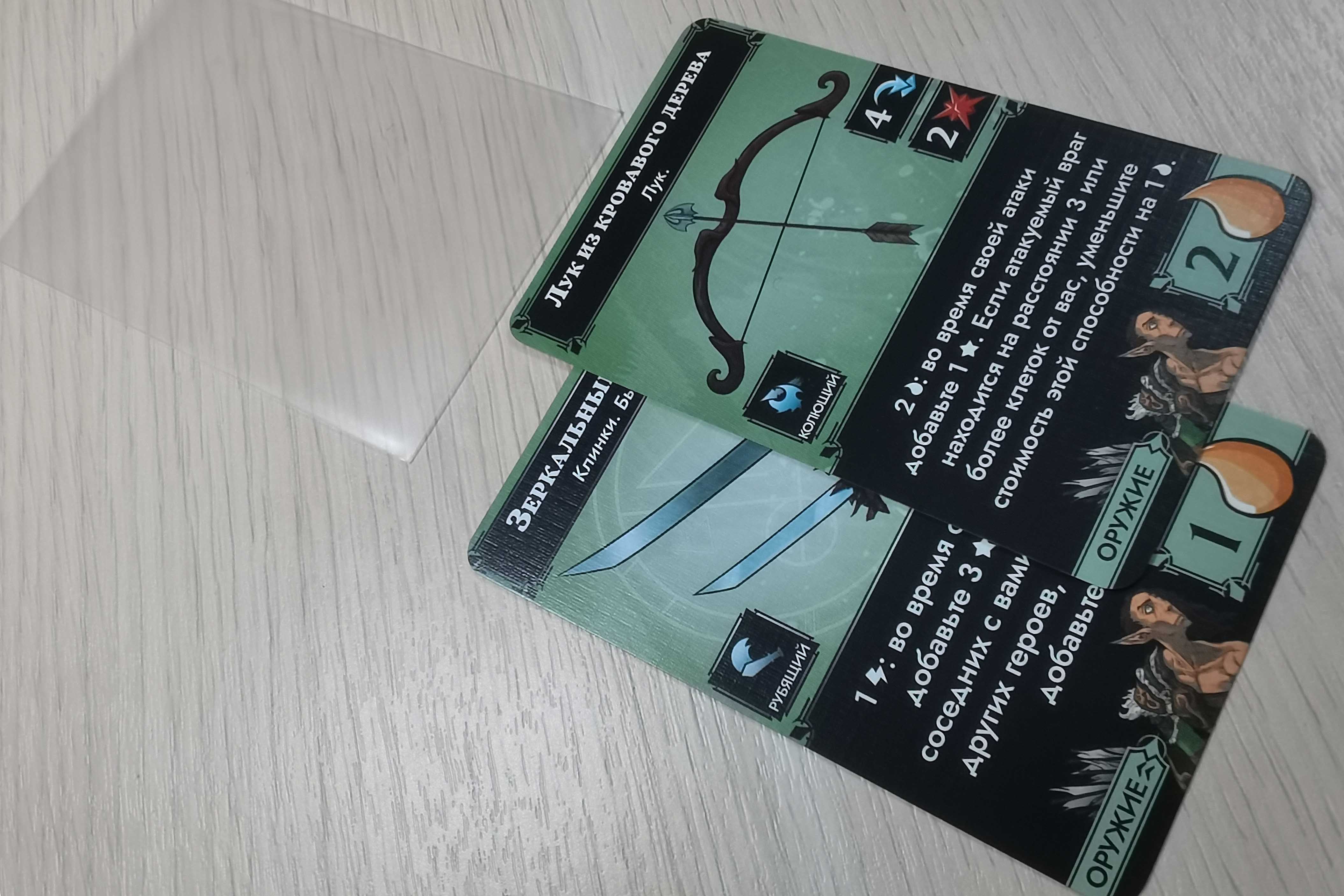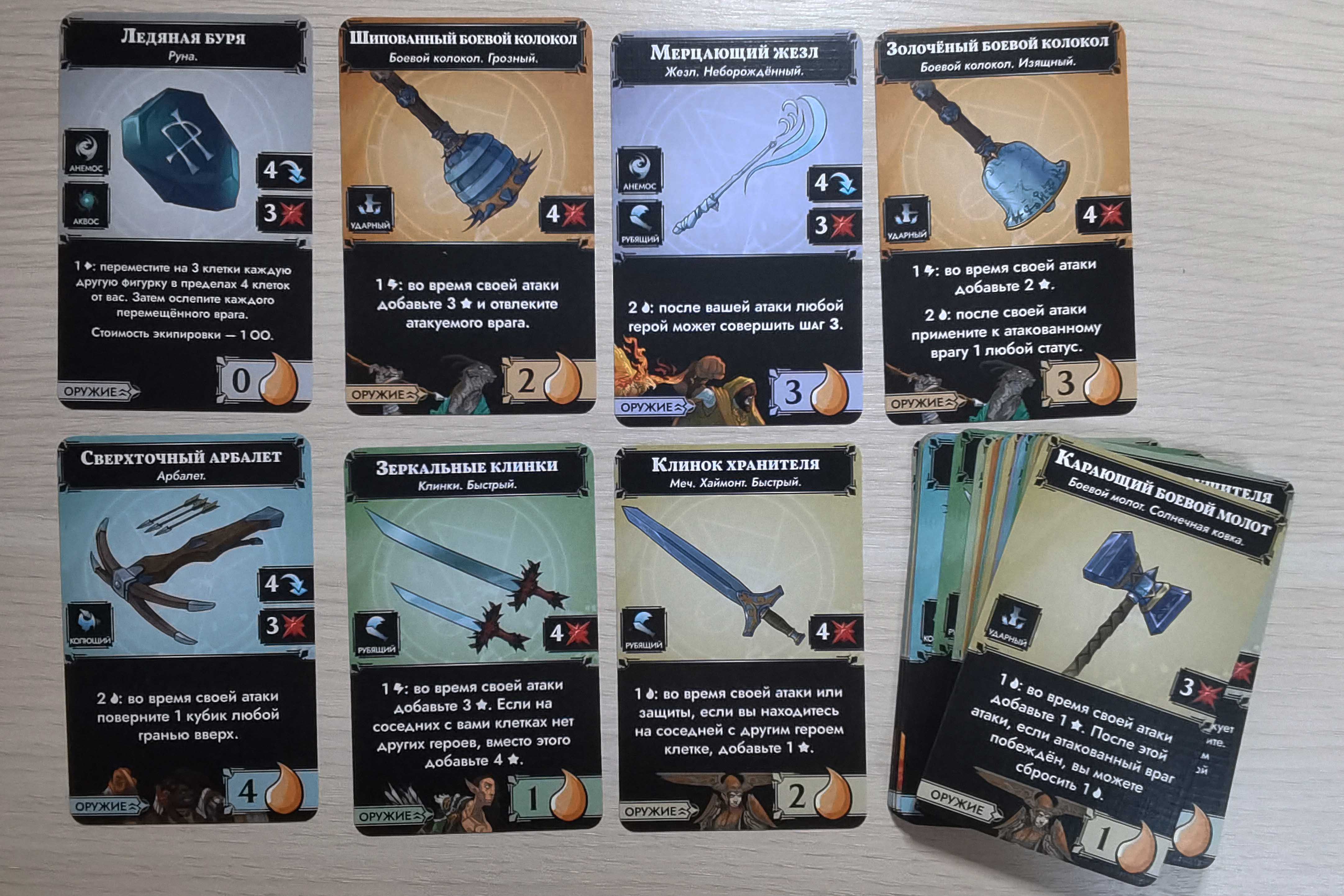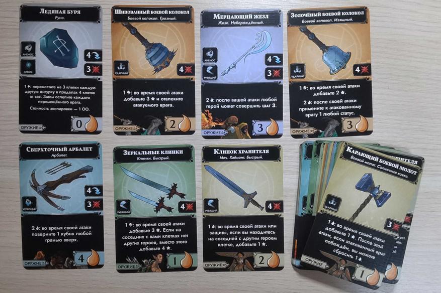 На одной стороне перечисленных карт находится описание обычной версии, а на другой — улучшенной. Оружие содержит информацию о типе урона, наносимых повреждений и дальности, а также активируемой способности. Обе оружейные карты следует сложить в один протектор — на каждой стороне получаем разный предмет.