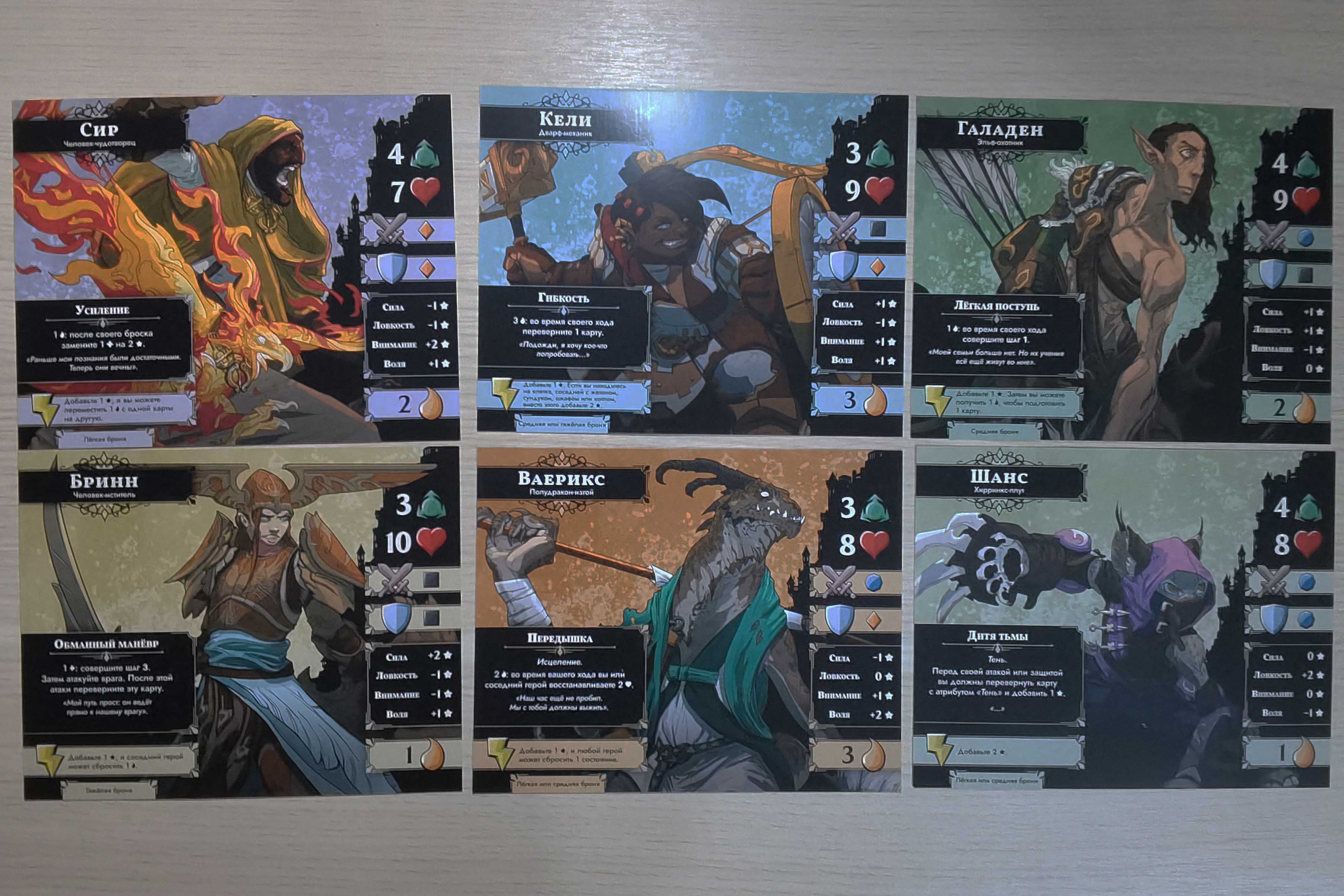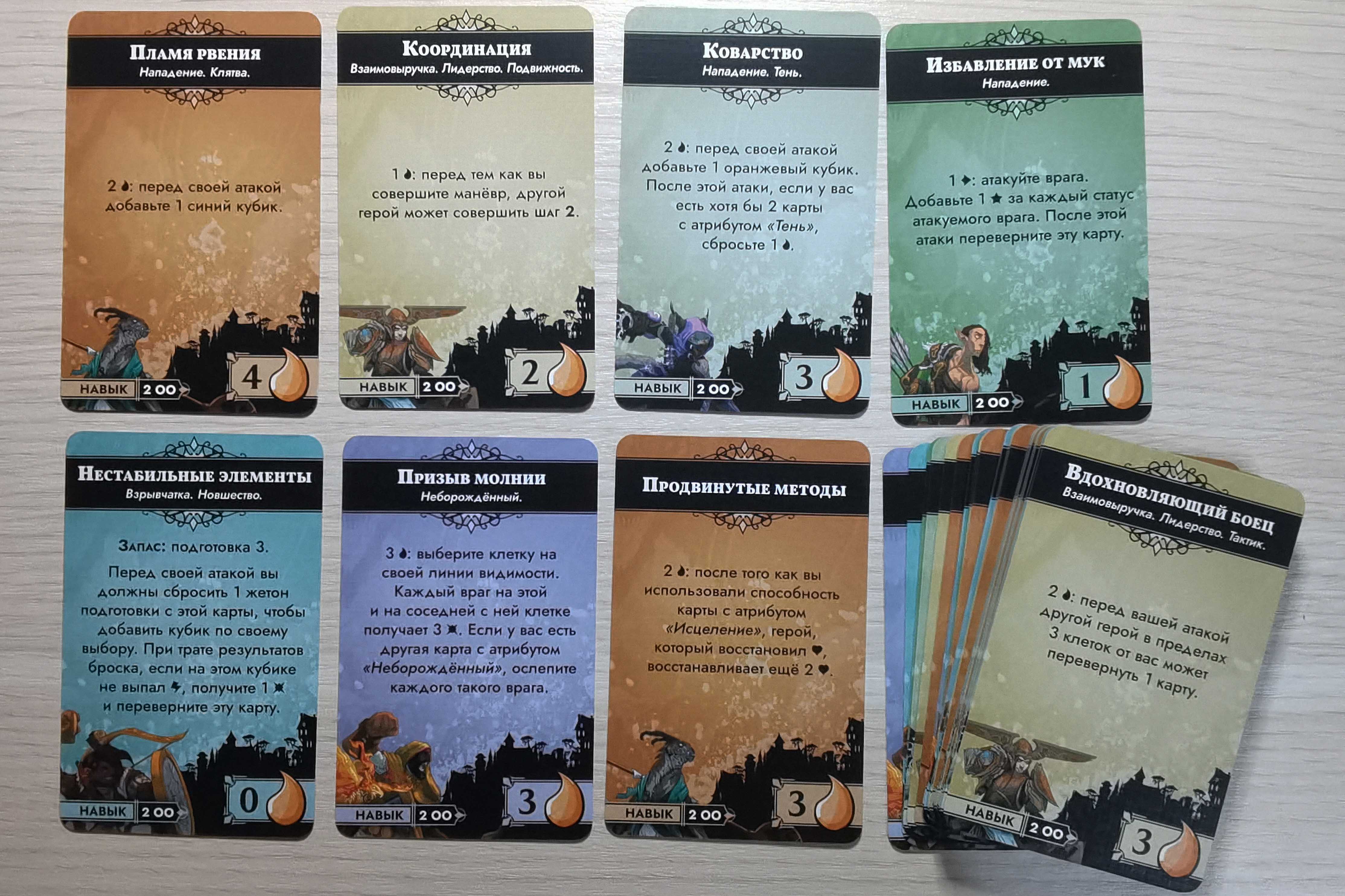 На счетчике жизней выставляется актуальное значение для персонажа. Также игроки получают фигурку, необходимые дайсы и памятку, на которой приведены все статусы и список доступных действий. Очередной этап приготовления к миссии — выбор карт навыков. У каждого есть своя цена в очках опыта — общая стоимость не должна превышать текущую опытность персонажа. Новые навыки открываются за выполнения миссий или индивидуальных мини-квестов (атаковать одного врага молотом дважды, обыскать определенное количество шкафов и так далее).