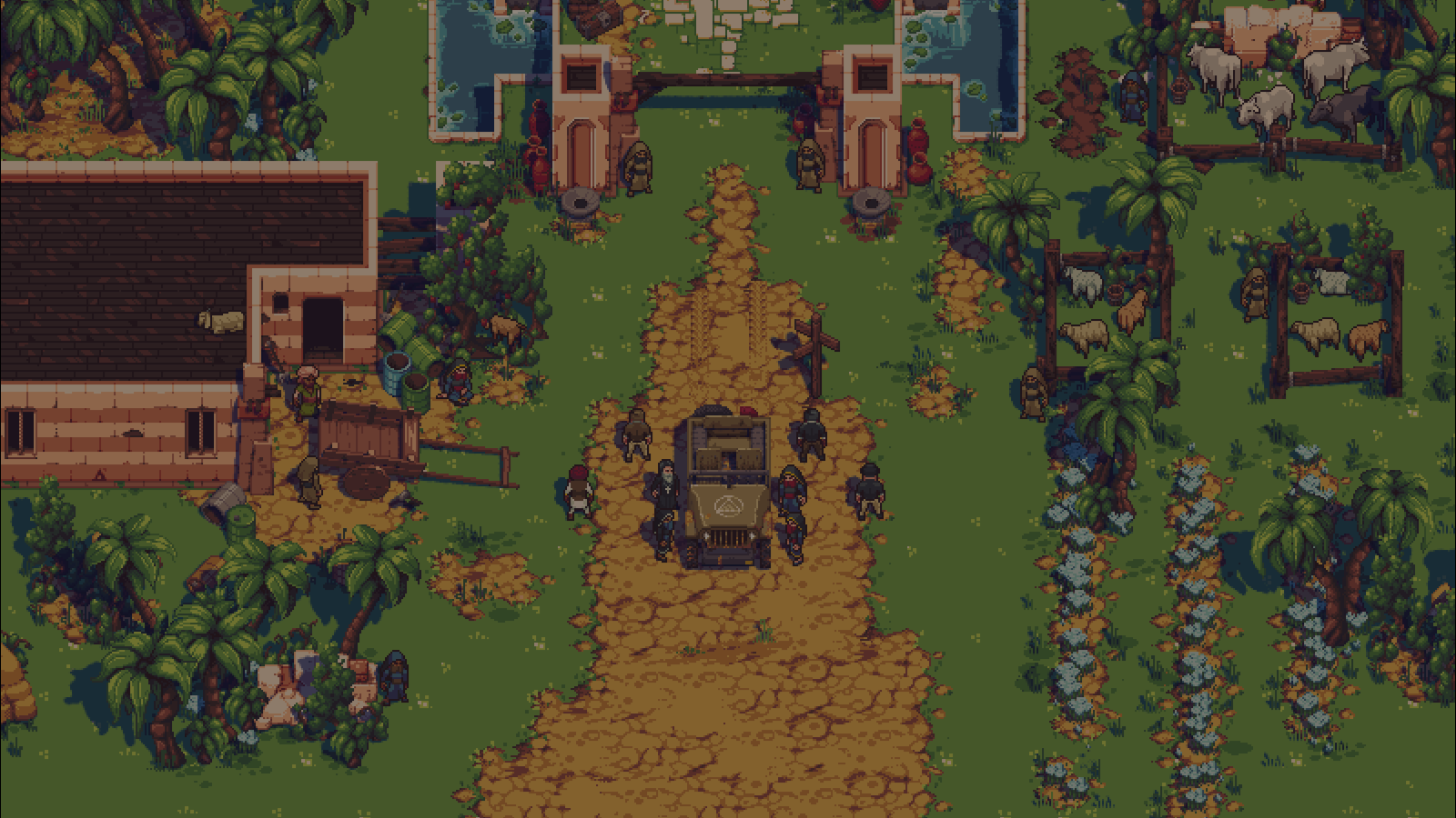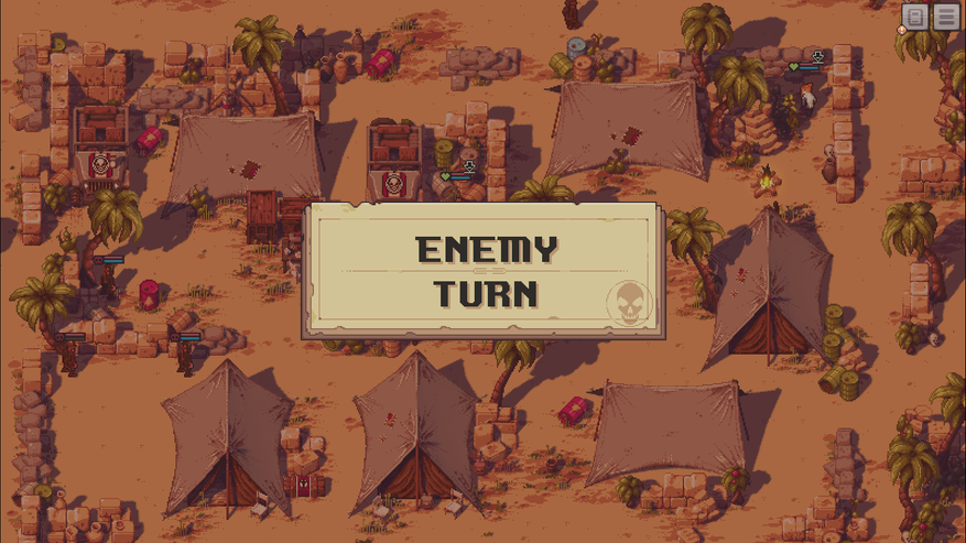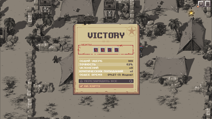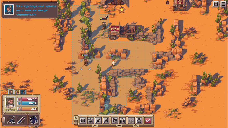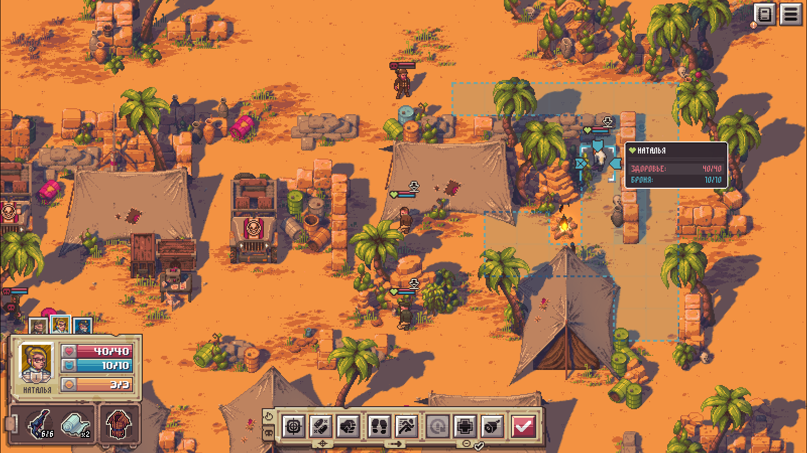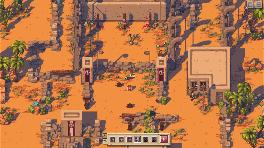Если вы хоть раз играли в X-Com, Jagged Alliance, Shadows Run или любую другую стратегию с пошаговыми боями, то вы сразу же поймете как тут ведутся бои. Сначала персонажи игрока выполняют действия, затем ход передается противнику и так пока у вас или противника не кончится вся живая сила. На ход дается несколько очков действия, в зависимости от параметров персонажа. Обычно этого хватает на «сделать передвижение и выстрелить», либо «выстрелить и смотаться за укрытие», которых по локации разбросано множество. Без использования укрытий персонаж очень быстро наполняется свинцом и падает на песок под его тяжестью. Я же говорил, что вам потребуется медик. Благо смерть наступает не моментально, а длиться несколько ходов — за это время вам нужно будет либо выиграть бой, либо вылечить павшего соратника.