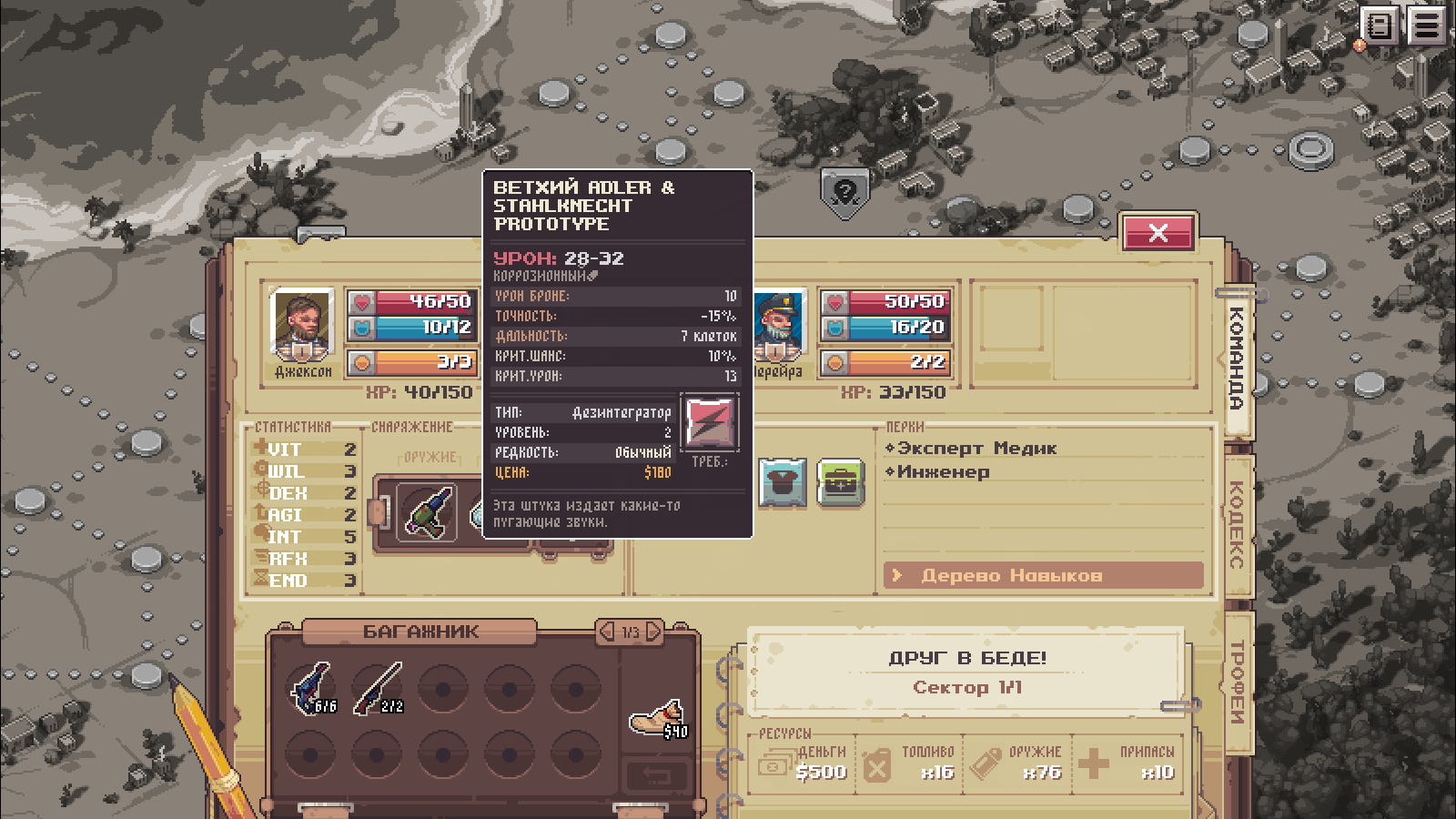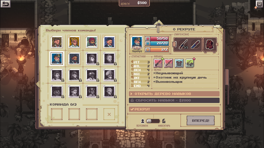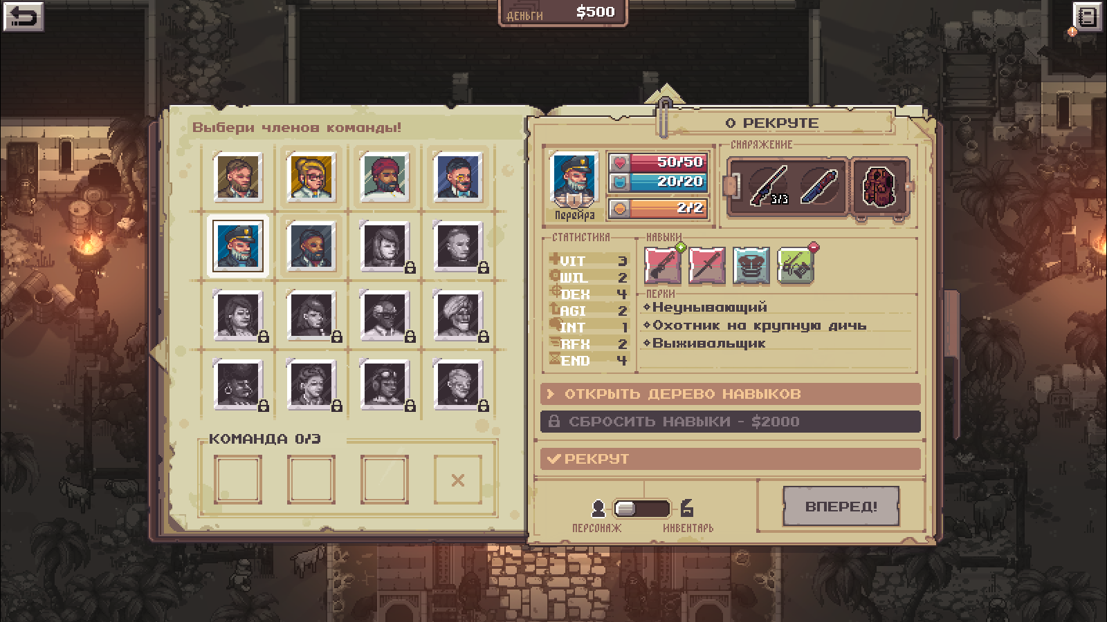 Как в любой порядочной RPG у нас на выбор есть несколько героев, которые отличаются не только внешним видом и оснащением, но и определенными навыками пассивными и не очень. Кто-то метко стреляет, кто-то умеет разгадывать тайные знаки, кто-то хорошо прячется, а кто-то просто хороший медик. По началу нам доступно лишь шестеро персонажей, но выбрать мы можем лишь трех. И к выбору нужно подходить с умом. Нельзя просто выбрать самых лучших бойцов и думать, что все пройдет как по маслу. Ибо как говорилось в отличном фильме: «Не нанимай на эту работу идиотов.»