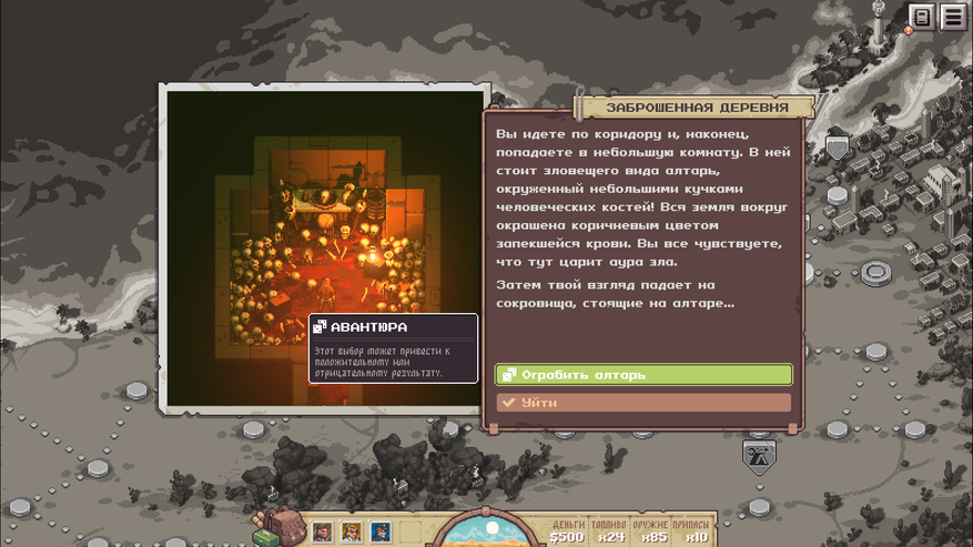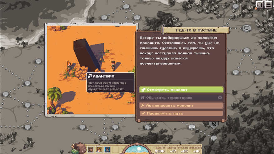Пустыня лишь поверхностно кажется пустой. Иногда, если игроку повезет, его отряд может наткнуться на какой-нибудь старый артефакт или даже древний храм, покоящейся под тоннами песка. И если в команде есть приличный археолог или иной знаток древностей, то велик шанс выйти из храма не только с пополненными припасами, но и с весьма внушительной суммой денег, которую можно потратить на более мощное снаряжение у снующих по пустыне караванщиков. Нет, грабить караваны вам никто не разрешал. Но если вы не послушали голо разума и наняли на работу крупных мускулистых парней, то у вас большие проблемы. И тут уже никакой медик, он же инженер, не поможет. Иногда бывает что разгаданный старинный ребус не даст игроку ничего полезного, но и ничего вредного от него не будет. Тоже не плохо. Что нас не убивает — то нас не убивает.