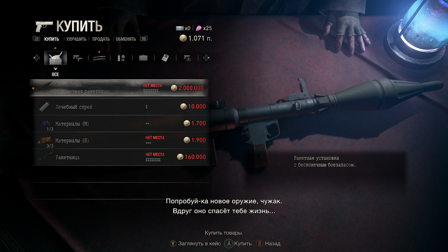 Прокачка в Resident Evil 4 Remake разносторонняя и связана с торговцем. Купить у торговца можно много предметов. Бронежилет, материалы, оружие, услугу по починке снаряжения. У оружия за деньги прокачиваются разные аспекты. Скорострельность, магазин (обойма), мощность выстрела, скорость перезарядки. Стоит это удовольствие дёшево. К концу прохождения у меня были почти полностью прокачены 3 пистолета, 1 пистолет-пулемёт, винтовка, дробовик и 2 ножа. Прокачка идёт за деньги, а обвесы на оружие находим и ставим сами. Торговец человек странный, иногда смешной. Он придумывает различные испытания. Выполнил задание и получи шпинель (особая валюта). Поручения примитивные. Убей крыс, убей особого врага, принеси сокровище, постреляй в синие амулеты. Выполнение иногда затруднительно, но у торговца есть карта всех сокровищ, которая показывает расположение задач. Покупаем обязательно. Обменять шпинели можно на особый апгрейд оружия, патроны, сокровища, оружие, прицел и другое. Именно потому, что я брал всё подряд не смог купить особый апгрейд (не хватило 1 шпинели). Хорошо, что прокачки за деньги хватает, чтобы эффективно сражаться. Ещё одной ошибкой было то, что продавал ценности, забыв о том, что их можно объединять. Получил драгоценный браслет, продавал, покупал апгрейд и шёл счастливый. Разочарование, когда узнал, что можно получить за тот же браслет в разы больше денег неописуемо.