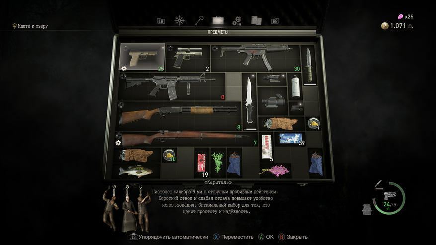У Леона в наличии чемодан, который является хранилищем для предметов снаряжения. Спасибо разработчикам, что важные сюжетные предметы и сокровища не заполняют инвентарь. Он вместительный, в него влезает несколько видов оружия и еще хватает пространства на патроны, аптечки и расходники. Если же игрок хочет таскать больше снаряжения, то купить улучшения можно у торговца за местную валюту. Ни разу за прохождение не возникло проблемы отсутствия свободного пространства, хотя арсенал приличный. Единственным недостатком стала система закрепления аксессуаров на пушки. Вы не сможете прицепить лазерный указатель на пистолет, чтобы он объединился с ним, но это будет отдельная ячейка в багаже. Решение странное, вызывало небольшое удивление и больше не беспокоило. Из материалов, которые игрок будет подбирать, можно создать полезные предметы. Трава зелёная восстановит здоровье. Трава красная усиливает эффект зелёной. Трава жёлтая даст прибавку к полоске жизни Леона. Все 3 травы можно объединить в одну колбу. Порох и разные железные материалы превращаются в патроны.
