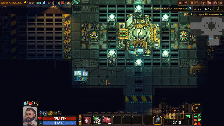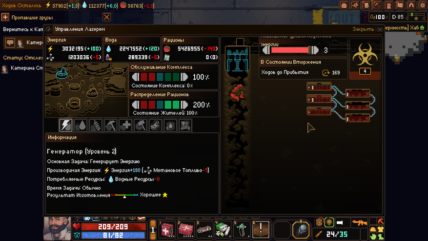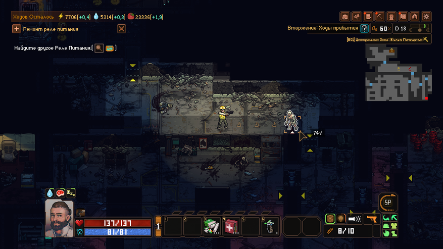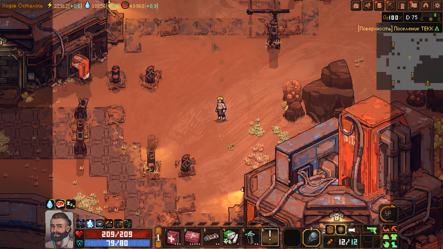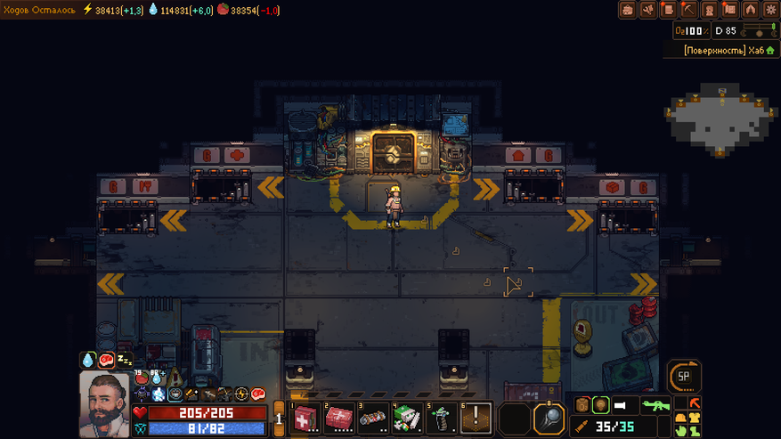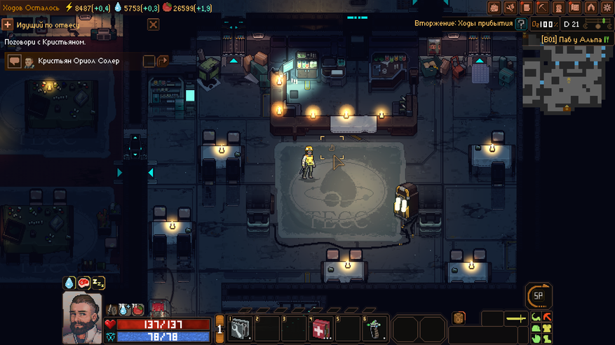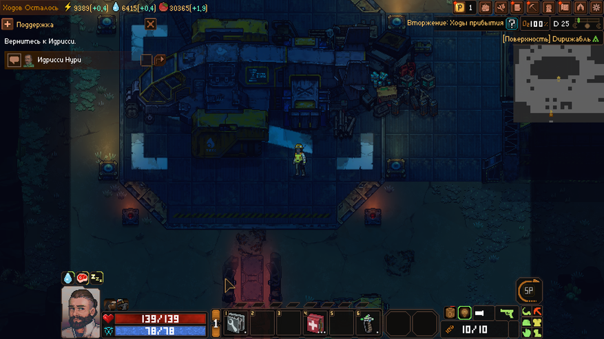Subterrain: Mines of Titan — это пошаговая игра, где каждый наш ход — это небольшой отрезок времени. За этот отрезок может быть сделано несколько действий как в лагере, так за его пределом. Несмотря на то, что под землей может быть только наш герой (все остальные жители там просто погибнут), на поверхности планетоида люди в основном не баклуши бьют. Бывшие исследователи и шахтеры распределили на себя роли по поддержанию полуразрушенной базы в надлежащем состоянии. Одни занимаются разведением растений для еды. Другие — очисткой воды (на Титане есть вода, но пить без очистки я вам ее не рекомендую). Третьи — добычей электропитания из метаносодержащей руды. Стоит только одной секции перестать работать — смерть ждет всех.