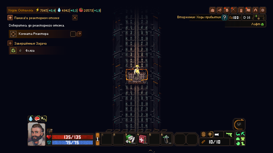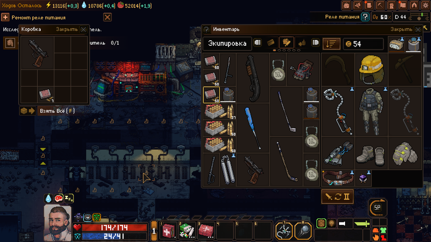 И все эти секции зависят лишь от того, сколько ресурсов мы принесем из следующего рейда. А продолжительным рейд быть не может. Наш герой, он хоть и геройский герой, но все же человек. Ему нужен отдых, еда и вода. И снаряжение, которое портится при столкновении с местной злобной фауной. И все это будет стоить материалов и даже денег.