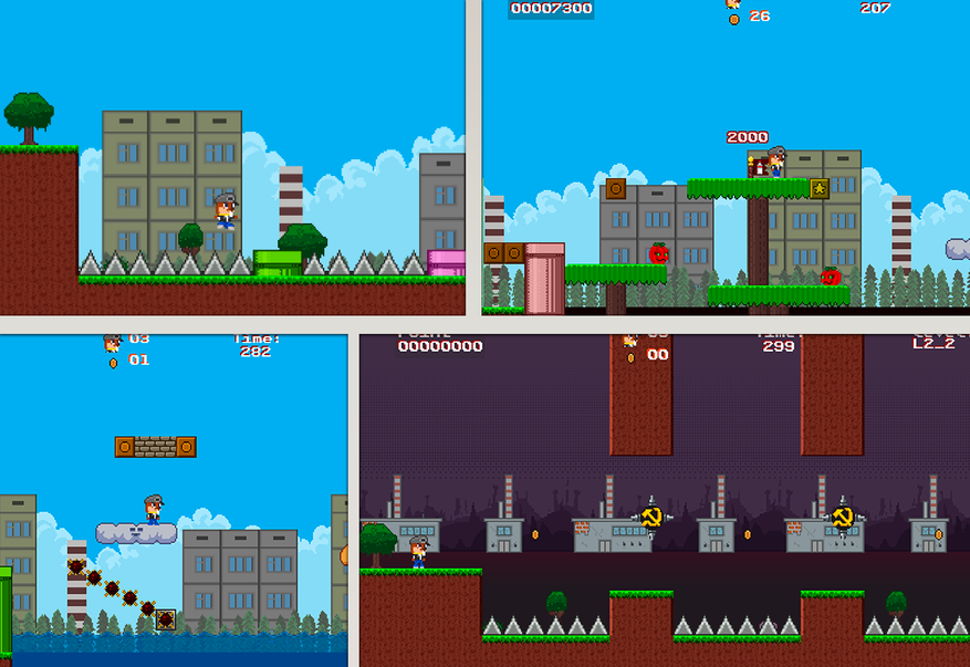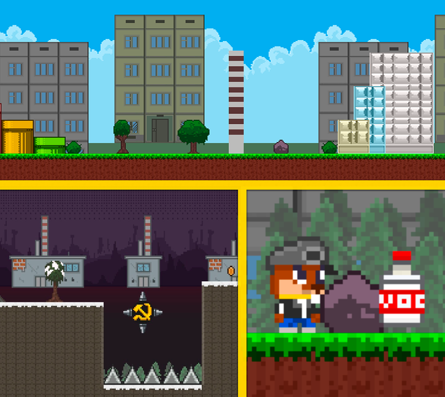 Пиксель-арт в игре выглядит уникально, и, похоже, не использует готовых ассетов (по крайней мере, мне не удалось найти что-то подобное). Главный герой — бобер в спортивном костюме, задние фоны с хрущёвками, заводами и трубами, а также различные повер-апы в виде серпа и молота вместо грибов и хилки, которые, по всей видимости, являются водкой.