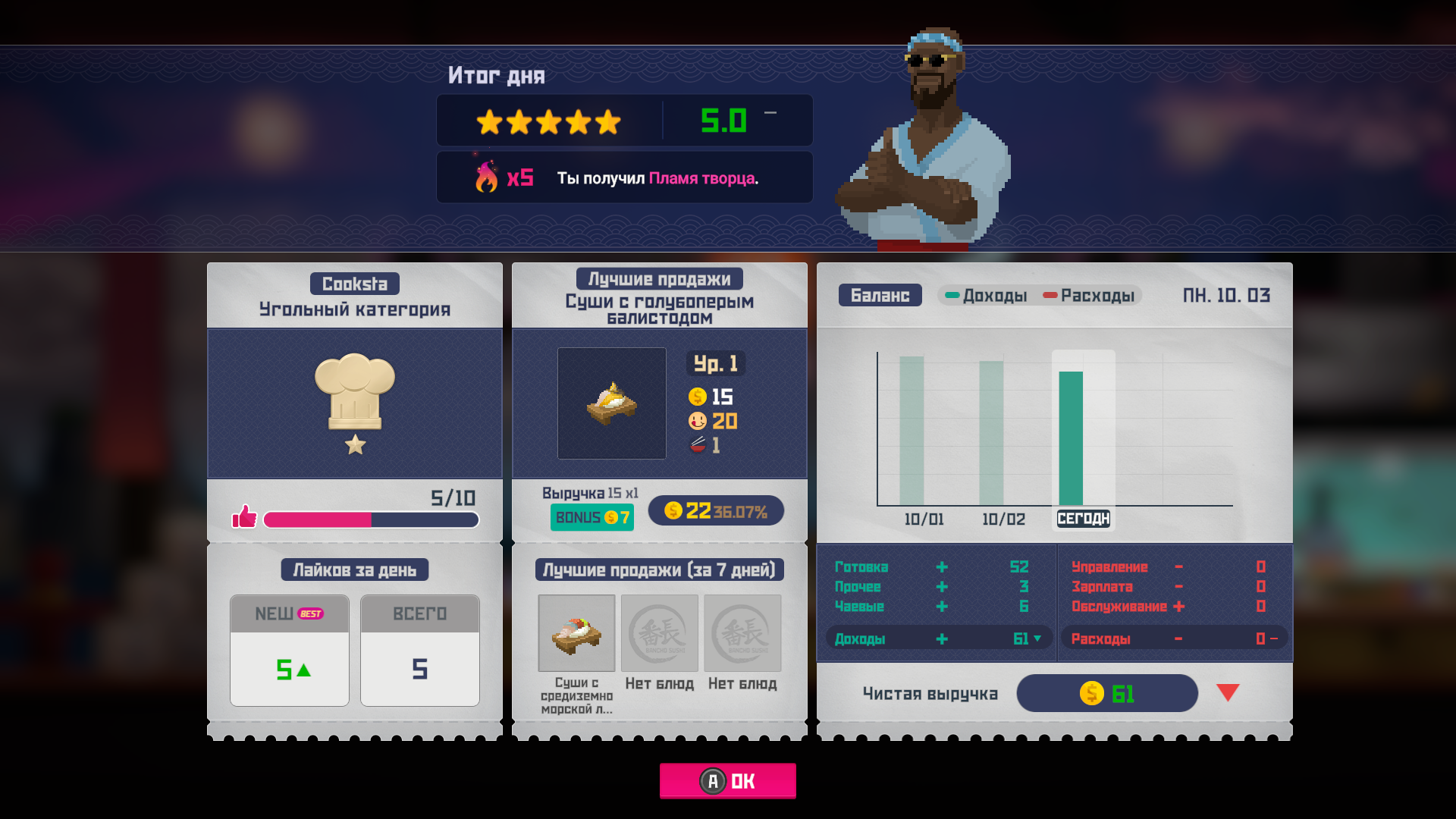 И вновь начинается гринд. И дайвер снова в пути. В пути на поиски рыбы, которая украсит меню заведения. Ну, а если читатель больше любит ковыряться на грядках а-ля Stardew Valley, то спустя время станет доступен огород, на котором тоже будут выращиваться продукты для заведения. Ну, а если у вас в душе живёт повар, то поединки а-ля Сома также будут ждать.