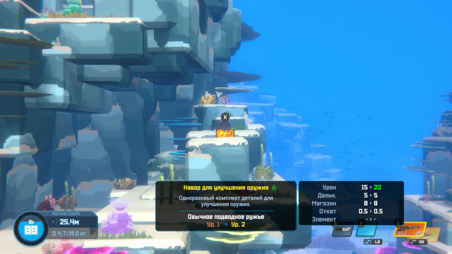 А ведь всё оружие прокачивается. Но вот ведь незадача… Стандартный гарпун также прокачивается, но он слабее, чем гарпун с накладываемым эффектом. Да, его несложно заменить, благо в воде уйма ящиков с оружием или у самого Кобры, но это дико утомляет… А теперь добавим к этому то, что время не резиновое, и с каждым днём будет появляться больше обязанностей.