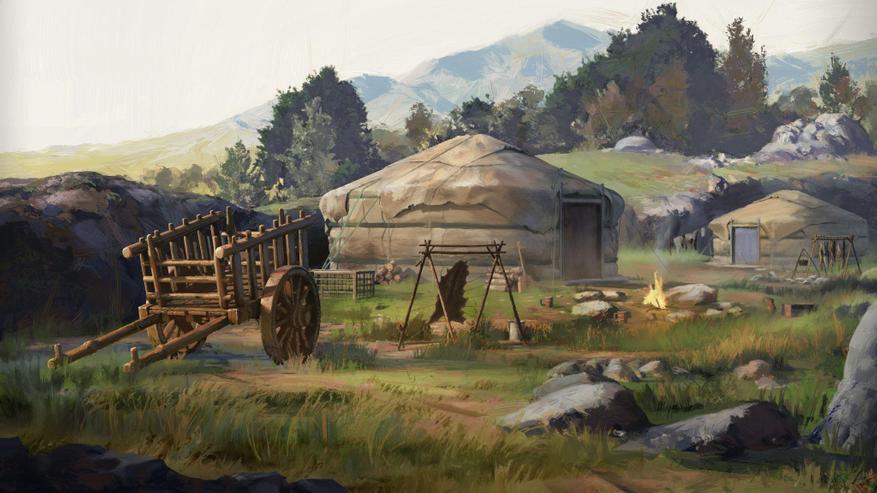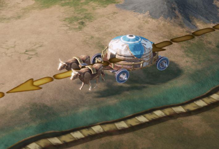 Одной из самых заметных визуальных новинок стала анимация перемещающегося кочевого лагеря — теперь, когда игрок принимает решение перенести стоянку, на карте вместо абстрактного обозначения появляется детализированная модель традиционной юрты, установленной на массивную повозку, которую медленно тянут волы. Это тщательно проработанное визуальное решение служит не только для усиления реализма игрового процесса, но и наглядно подчеркивает фундаментальное отличие кочевого образа жизни от оседлого, демонстрируя всю специфику постоянного передвижения целых народов вместе со своим имуществом по бескрайним степным просторам.