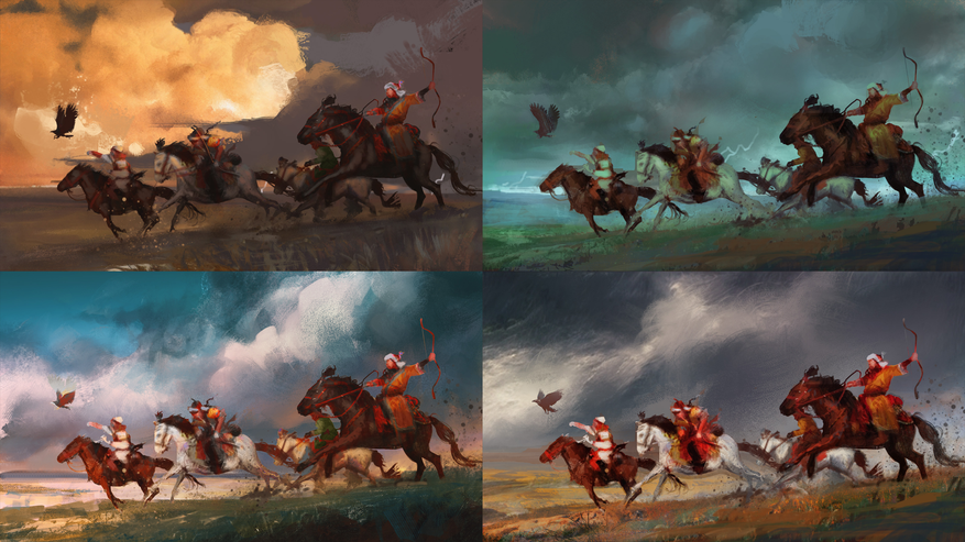 Как пояснил Лукас Рибейро, ведущий специалист по 2D-графике в CK3, команда стремилась передать «великолепие степей и кровавую романтику восточных сражений» через искусство. Одним из ключевых элементов стала переработка загрузочных экранов. На ранних этапах было рассмотрено несколько концепций, но в итоге выбор пал на динамичную сцену с отрядом всадников, атакующих под грозовым небом.