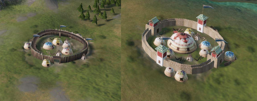 Степные народы получат совершенно новый визуальный стиль на карте — их поселения будут представлять собой живописные скопления юрт с разноцветными крышами, окружающие величественный шатёр хана. Особое внимание уделено религиозным центрам: святилища Тенгри украшены традиционными овуу — каменными насыпями с развевающимися разноцветными флагами, создающими узнаваемый силуэт. Что касается укреплений, разработчики нашли изящное решение исторической дилеммы: хотя кочевники не строили массивных стен, в игре появились символические частоколы, сочетающиеся с юртами как внутри, так и снаружи условных границ. Такой подход сохраняет игровую логику осады, но визуально подчёркивает характерную открытость кочевых поселений в сравнении с замкнутыми крепостями оседлых культур.