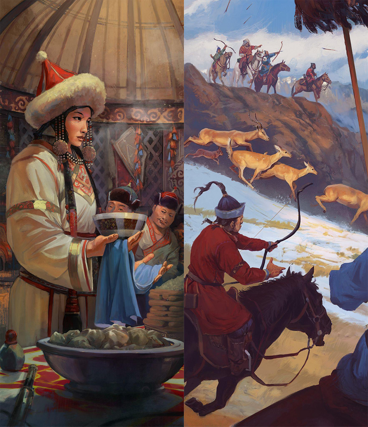 Подобные сцены не только визуально насыщенны, но и отражают важную часть кочевого быта, где охота была одновременно развлечением, тренировкой и способом добычи ресурсов (что также будет отражено в механиках игры).