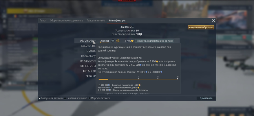 Да, полностью прокачанный экипаж с асами также может улететь от подрыва боеукладки после одного попадания. Вот только полностью прокачанный мехвод и наводчик дают очень ощутимое преимущество, также как и скорость ремонта. А без прокачки устойчивости к перегрузкам и выносливости вообще нечего делать на высоких рангах авиации. Я думаю, что у многих случались ситуации, когда буквально чуть-чуть не хватало, чтобы пилот восстановился от потери сознания. И вот этого «чуть-чуть» не хватало для очереди из пушки или пуска ракеты. Эта и есть та самая грань, которая отделяет Эксперта от Аса. Конечно бывают ситуации, когда и Асы не спасают, но это всё равно даёт вполне реальное преимущество.