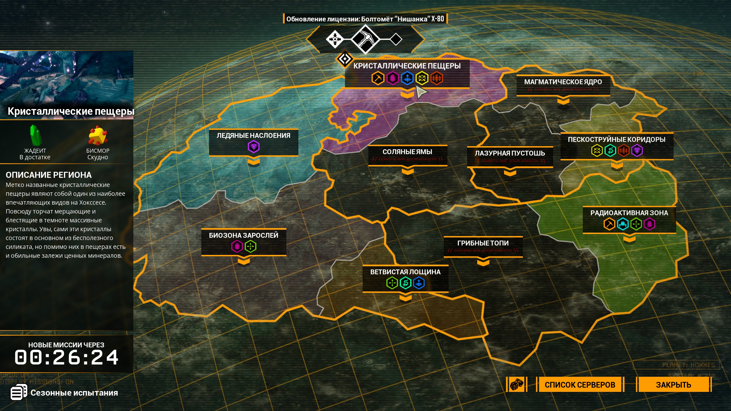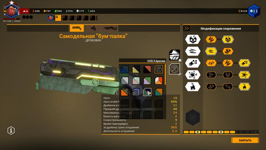 Прокачка оружия и снаряжения происходит через покупку и установку модулей, но не всё так просто: кроме денег, нужны ресурсы, которые добываются в биомах во время миссий.