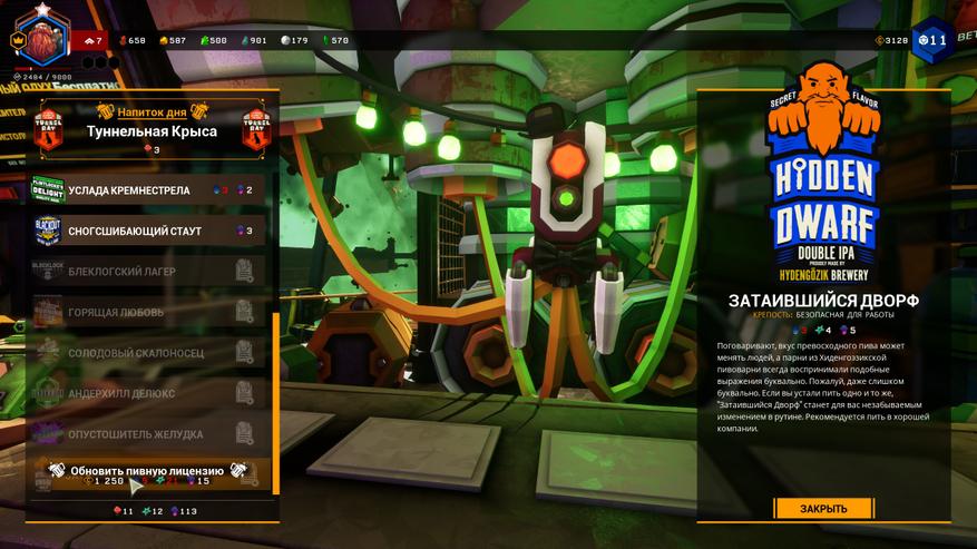 Поэтому в игре огромный выбор пива с уникальными приколами. Собирая ресурсы и прокачивая уровень, вы открываете разные сорта — от базового пойла от компании до разнообразного крафтового. Каждое пиво несёт шуточные эффекты, но есть и по-настоящему интересные.