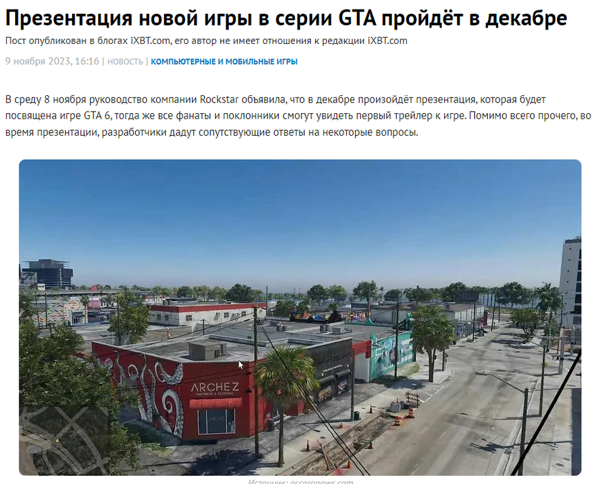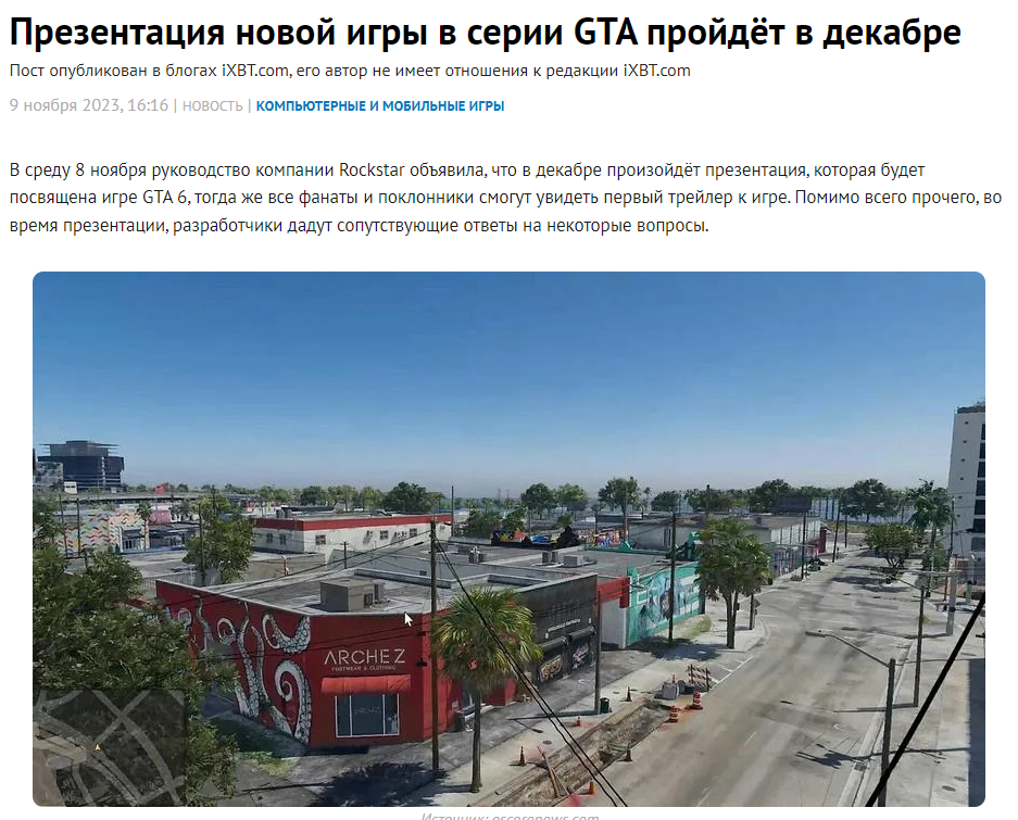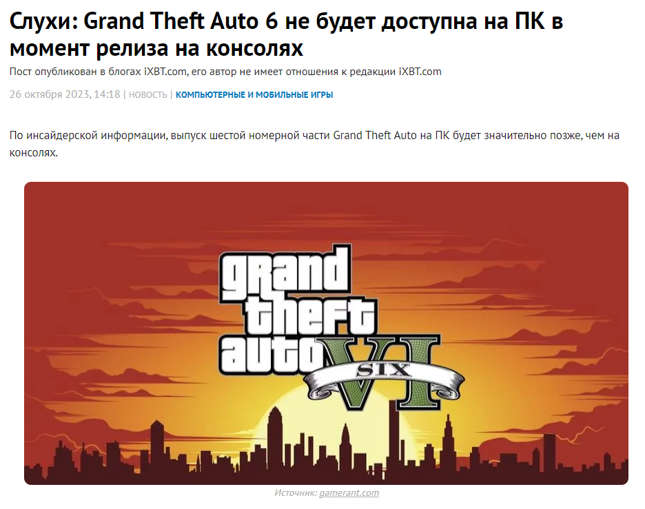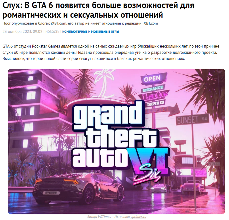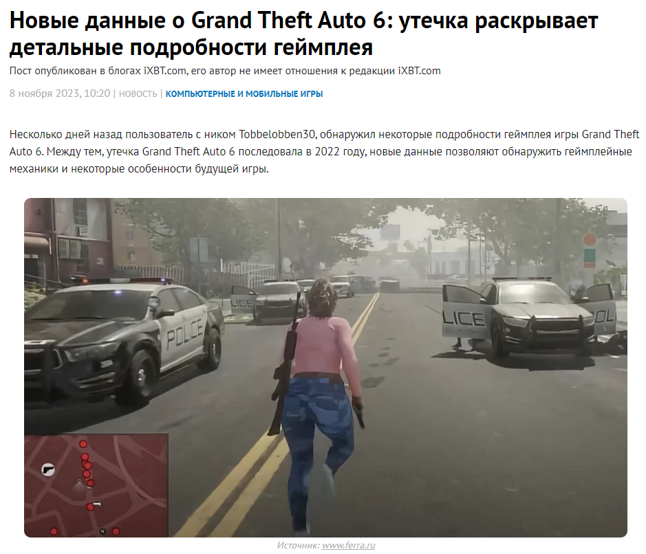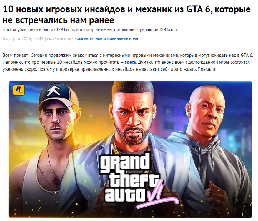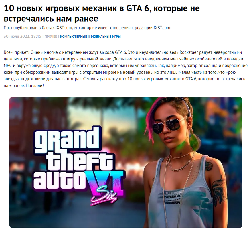 Кстати, когда я говорю о «различных соцсетях, форумах и сайтах», то я имею в виду ещё то, что это коснулось и русскоязычное сообщество. Прошерстив блоги на iXBT, я нашёл минимум одного автора, занимающимся собственными вбросами по GTA VI и ещё десяток новостников, которые любят публиковать чуть ли не каждую смехотворную теорию по игре. Сразу скажу, что к последним претензий не имею. Все мы пытаемся зарабатывать как можем. Но я надеюсь, что они не верят во всю эту чушь, которую переписывают!