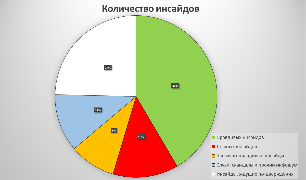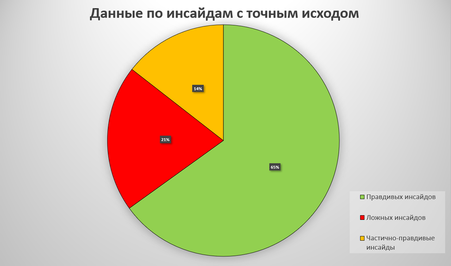 Про инсайдеров я уже делал отдельный блог, где показывал статистику, благодаря которой вскрылся факт того, что правдивых сливов оказывается слишком много. За последнее время динамика осталась прежней, лишь прибавились новые переменные, ждущие подтверждения или опровержения.