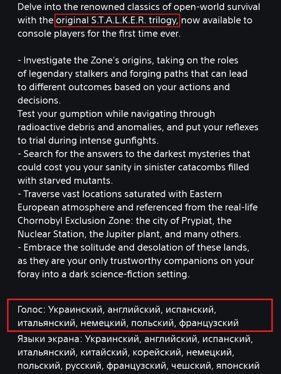 Помимо этого, портированная трилогия S.T.A.L.K.E.R. осталась без русской озвучки. Есть только субтитры. Из-за этого, игра, по умолчанию, звучит на английском языке.