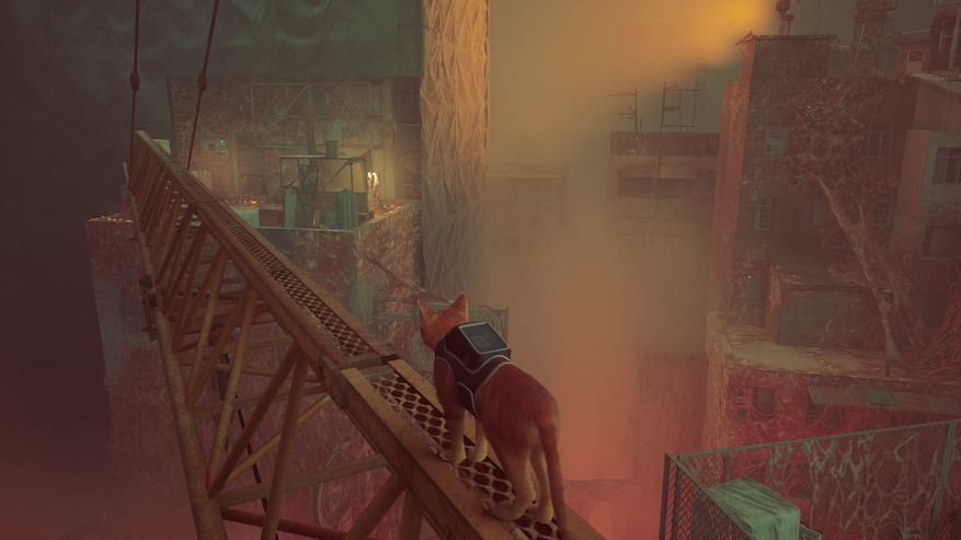 В игровом плане Stray не изобилует возможностями, но неплохо чередует их так, что они не надоедают тебе. Как правило, ты просто ходишь и прыгаешь по разным платформам без каких-то глубоких механик, иногда передвигаешь объекты или используешь робота-помощника, чтобы как-то обойти угрозу. Также проект порой даёт тебе для изучения просторные локации, поселения роботов, где приходится заниматься собирательством предметов, сюжетных и опциональных, этакий примитивный квест. Поселения исследовать интересно, потому что это такие запутанные лабиринты, где есть много приятных мелочей.