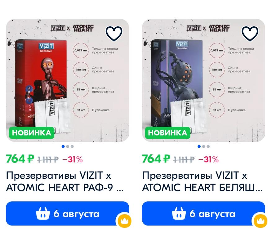 Популярный производитель презервативов VIZIT выпустил на рынок линейку концетраптивов по мотивам популярной игры этого года Atomic Heart. Продаются они на торговой площадке OZON по цене 765 рублей за упаковку. В которой находится 12 презервативов, без запаха и вкуса.