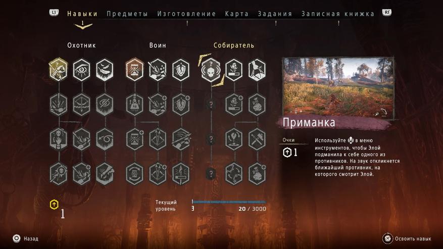Разочаровывает и система развития персонажа, которая сегодня кажется донельзя вторичной. Вся прокачка состоит из четырёх направлений: охотник, войн, путешественник и собиратель. Если, не слишком торопиться с прохождением повествовательной части, то довольно скоро можно обзавестись всеми доступными улучшениями и в некоторых случаях получить ощутимое преимущество.