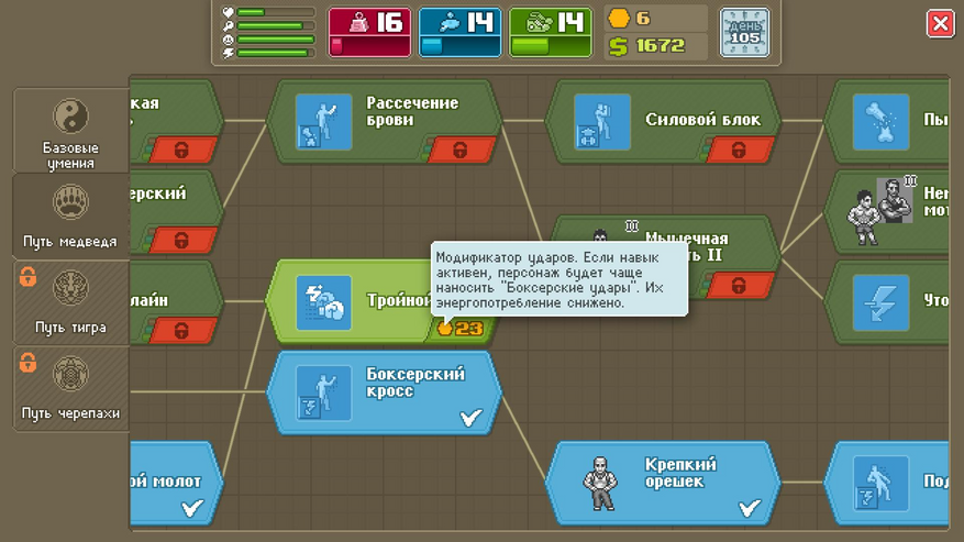 Тут всё понятно. Тренируемся, участвуем в боях получаем очки и тратим их на освоение новых приёмов. Однако, стоит быть внимательными в выборе т.к. многое зависит от того какой характеристике вы отдаёте предпочтение. Иными словами, если вы поспешите набрать самых крутых на ваш взгляд, то может оказаться что вы взяли те, которые совершенно не подходят для вашего персонажа.