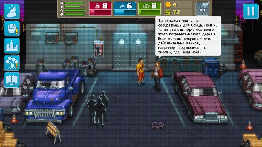 Надо сказать, что с первых минут меня затянуло с головой в первую очередь из-за того, что данная игра просто изобилует пасхалками и отсылками. Тут вам и Черепашки ниндзя из 90ых и Джей и Молчаливый Боб и даже толстый намёк на первого Терминатора. Чем славились 90-ые? Правильно, пусть и слабо сюжетными, но добротными фильмами в жанре боевик. И надо сказать тут с этим тоже полный порядок. А вот сама игровая часть, к сожалению, подкачала… Всё сводится к тому, что наш персонаж качается, дерётся, работает, теряет характеристики на среднем уровне сложности. Тут многие скажут ну так играй на простом в чём проблема? Проблема заключается в том, что на простом уровне сложности не засчитываются достижения, а это не очень приятно. Однако такая манипуляция изначально не идёт игре на благо. Как игрок я хочу получать достижения, но на среднем уровне сложности наиграв 161 игровой день я толком так и не продвинулся по сюжету. Плюс разработчики ой как за зря давали пустые обещания говоря, что вторая часть выйдет в 2017. Вышла она лишь в этом 2023 году