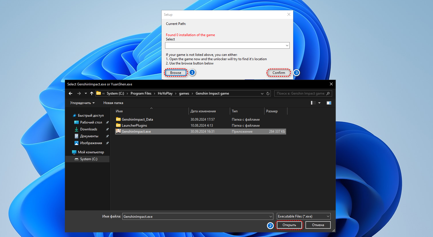 4. Вписываем предельное количество FPS и нажимаем на кнопку Start Game. В появившемся окне указываем путь до GenshinImpact.exe. Подтверждаем выбор.