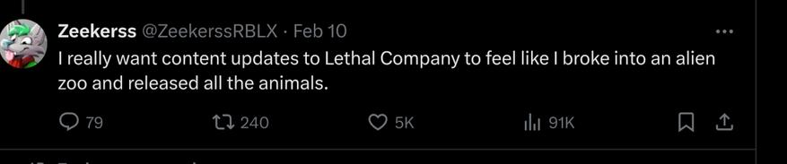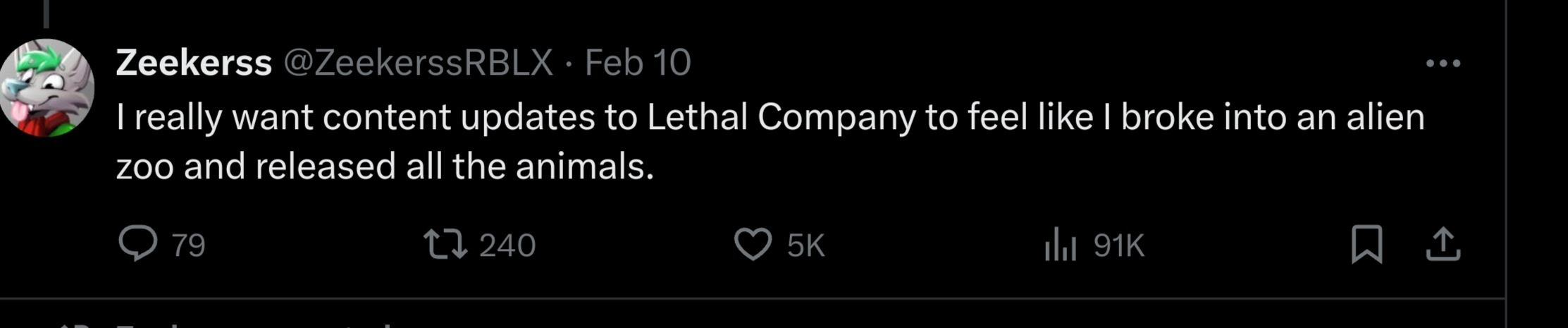 Разработчик Lethal Company в своих социальных сетях рассказал, что 50 версия игры уже готова и он мог бы выпустить её в любой момент, но он считает, что обновлениям пора стать более комплексными и большими.