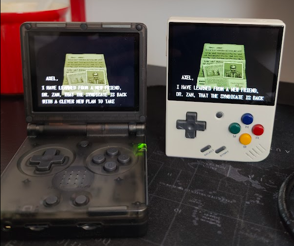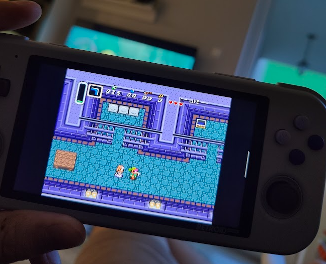 - Anbernic RG35XXSP — реплика лучшей версии Game Boy Advance SP. Классный форм-фактор «раскладушки», при этом работает с кучей эмуляторов. Я периодически подключаю его по HDMI к проектору и играю перед сном на огромном экране.