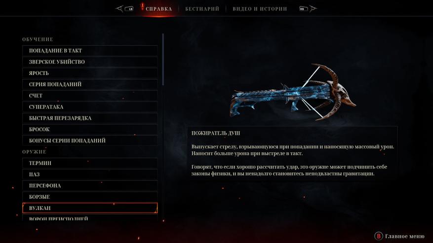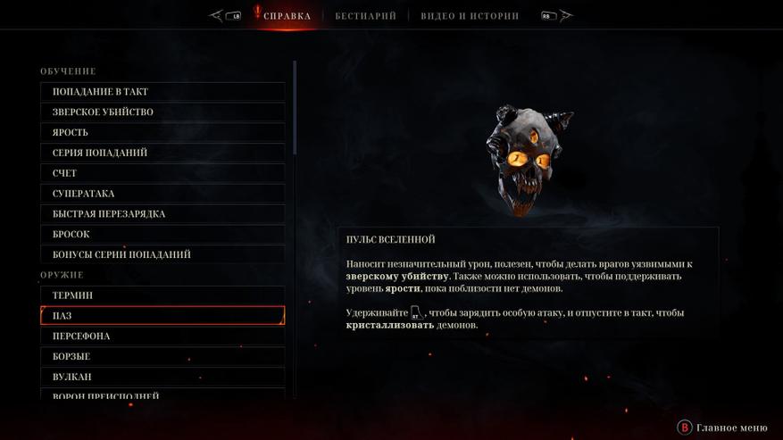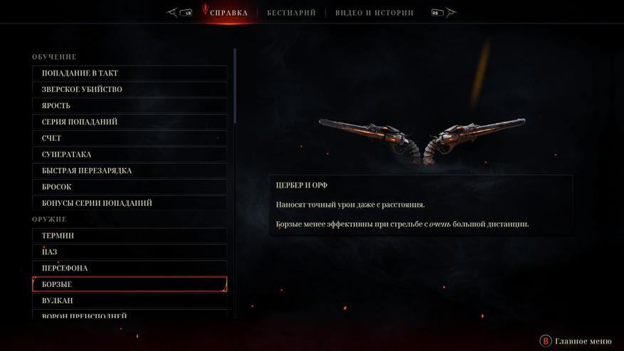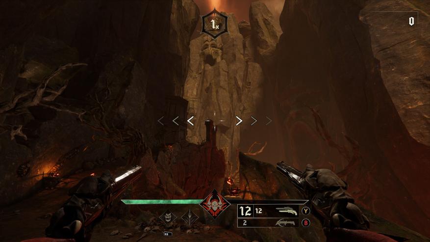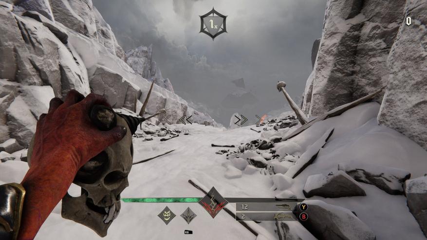 Это ритм-шутер. Игра завязана на нажимании кнопки атаки в такт музыке. Чем чаще попадаете в так, тем выше ярость, показатель которой влияет на урон. От показателя ярости так же зависит момент музыки, который будет играть. Если показатель ярости 2-4 то играет вступление, если уровень 8 то вокалист начинает петь слова из куплетов, а если вы подняли уровень до 16 музыка начнёт играть на полную катушку и будет идти припев. Музыка играет постоянно, и поэтому на звуки выстрелов и окружения обращать внимание не приходится. Настреляться тут дают вдоволь, ведь патроны бесконечные. Видов оружия не много, но каждое оружие уникально. По началу доступен только меч, которым легко попадать в такт и он особенно эффективен против мелких противников и щитников, урон средний. Позже появляется череп Паз, которым попадать в такт ещё легче, он быстро накапливает ярость, но его недостатком является маленький урон. Это были 2 постоянных оружия, которые всегда с вами, а теперь приступим к пушкам, которые открываются по мере прохождения уровней и выбрать можно только 2 экземпляра, которые вы возьмёте с собой в бой. Они подробно описаны ниже. Моим набором были револьверы и арбалет. Револьверы хороши на любой дистанции, да и с ними попадать в ритм удобно. Арбалет имеет самый мощный урон, но попасть в ритм сложновато. Другое оружие, на мой взгляд уступает в эффективности. Дробовик по урону не сильно круче револьверов, но в ритм им попасть мне не удавалось и я его не использовал. Бумеранги, они же "вороны преисподней" самое не нужное оружие, т.к. урона мало, в такт я вообще не попадал. Возможно, предпочтение в оружии в данной игре у вас будут иные, как и во всех играх, и вам удастся раскрыть потенциал всех пушек, но я не смог.