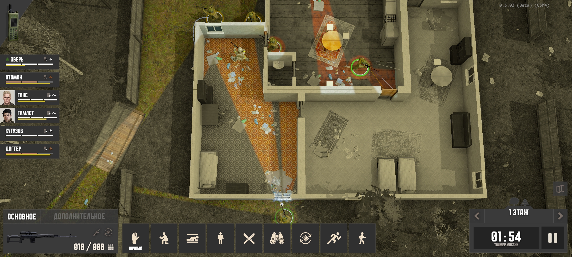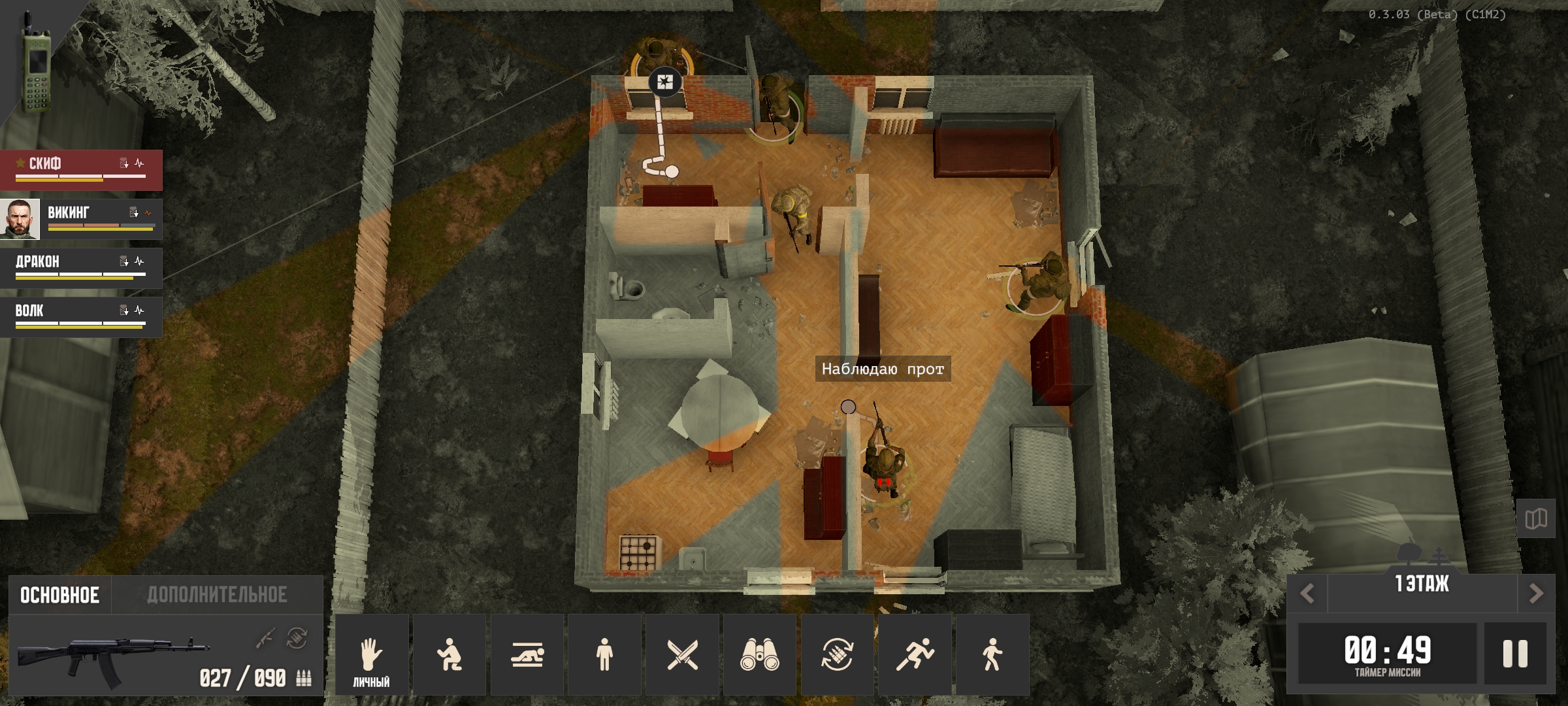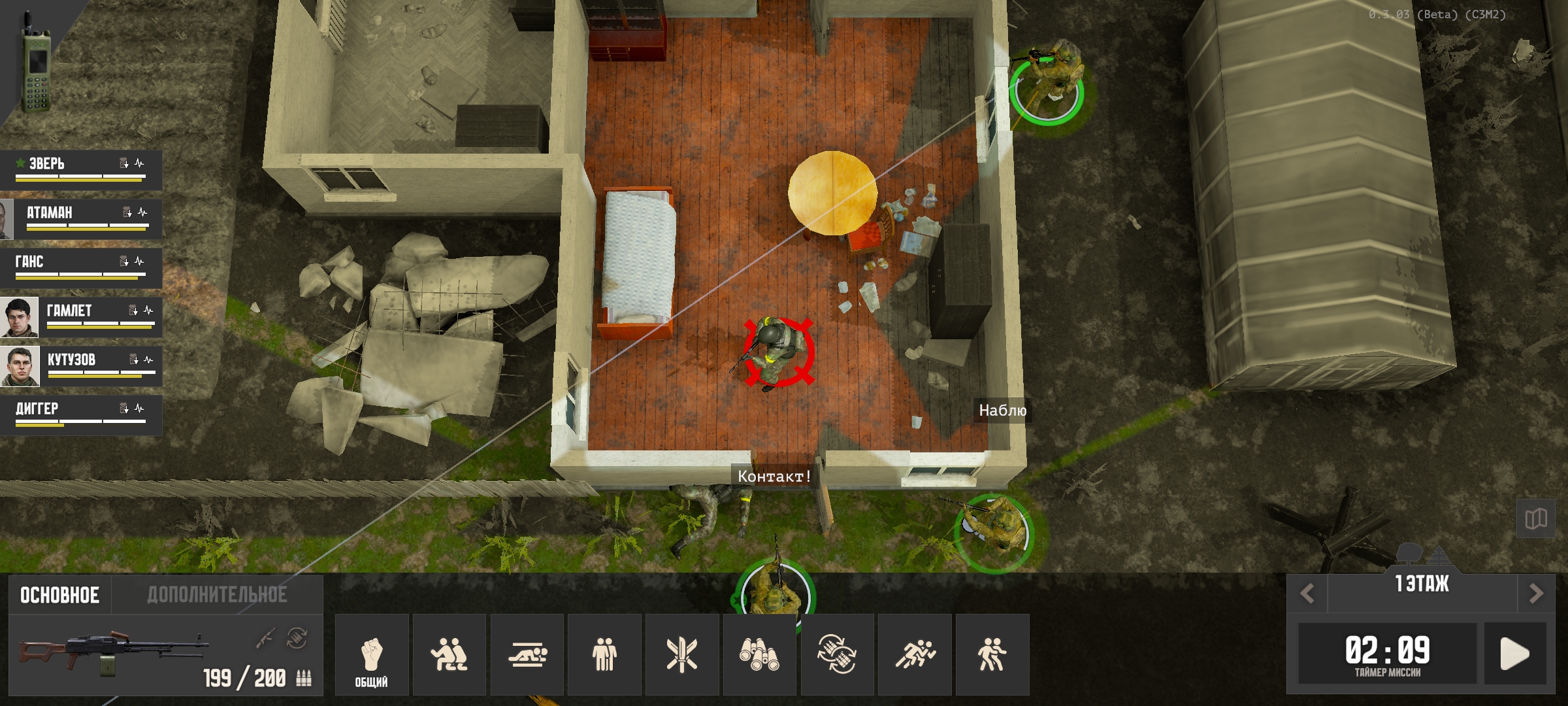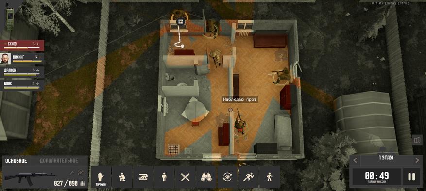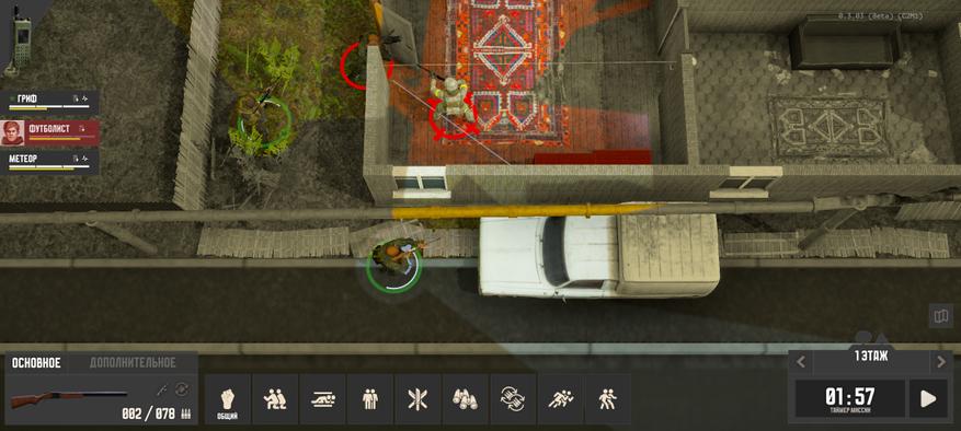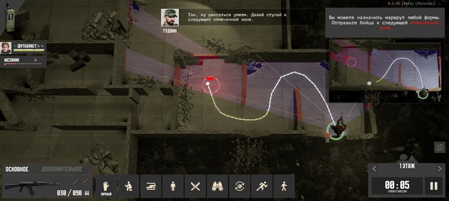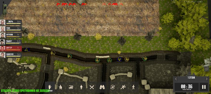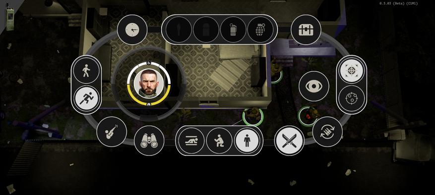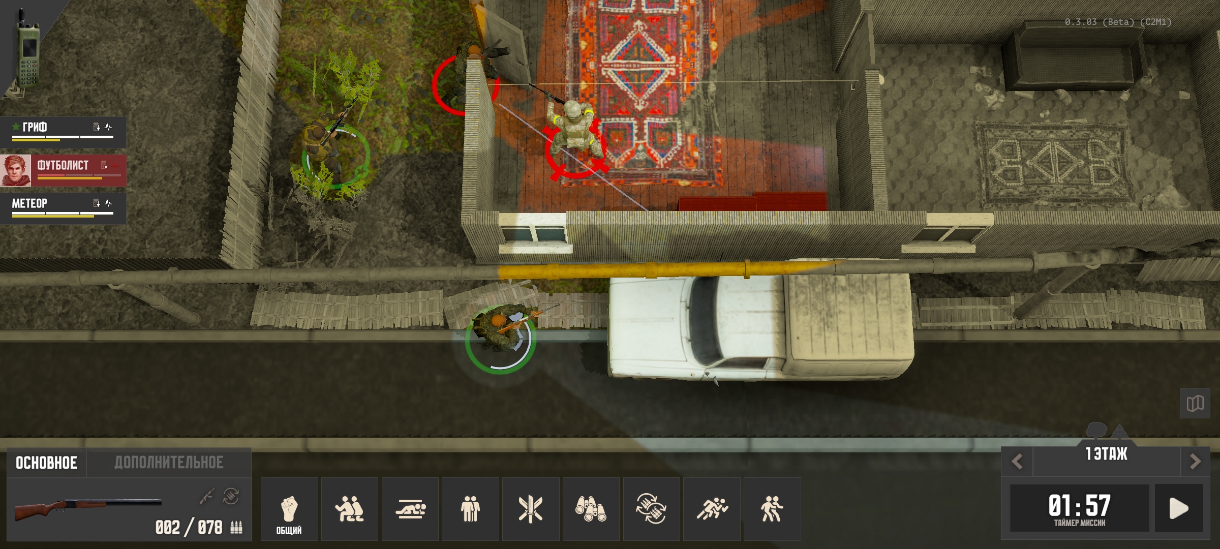 Боевая система построена по принципу Door Kickers. Мы не выбираем бойцу цель стрельбы. Мы направляем его угол обзора и ставим одну из двух команд: стрельба первым либо стрельба в ответ (разведка). Есть ещё дополнительные команды, типа огня на подавление или, допустим, броска гранаты. Но главный принцип это не меняет. Угол обзора автоматически настраивается либо в направлении движения, либо в направлении вражеского обстрела. Угол обзора в ручном режиме выбирается в расширенном меню команд нажатием на значок глаза. Важно, что при нажатии на данную команду, игра отображает нам только четыре направления четырьмя глазиками вокруг персонажа. Но по факту мы выбираем любое интересующее нас направление. То есть боец может бежать вперёд, а смотреть при этом хоть позади себя, хоть в сторону под любым нужным нам углом. Игрища с выставление угла обзора — важнейшая механика всей игры.