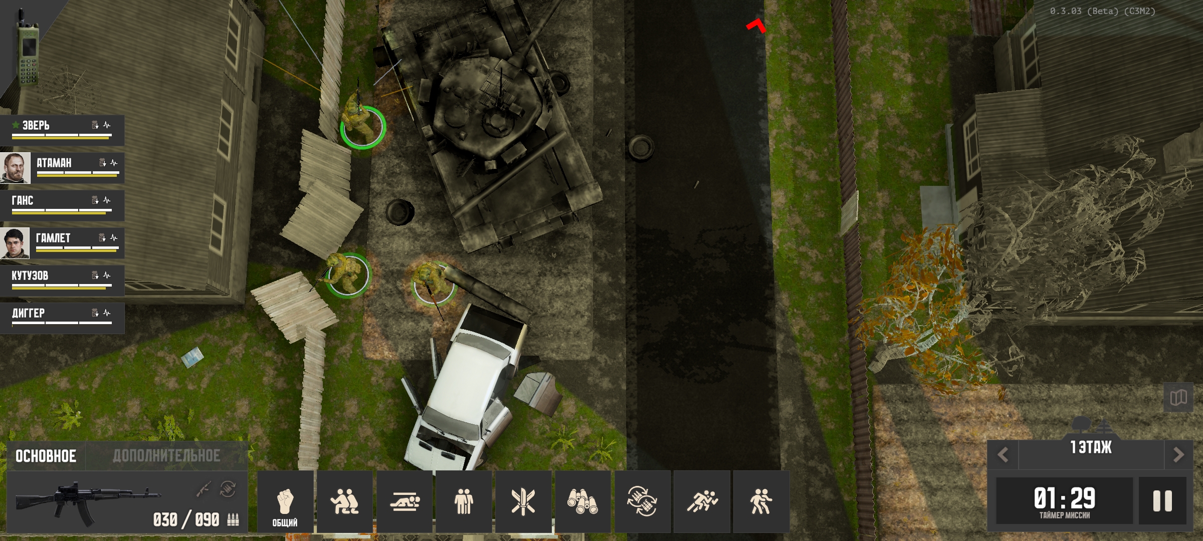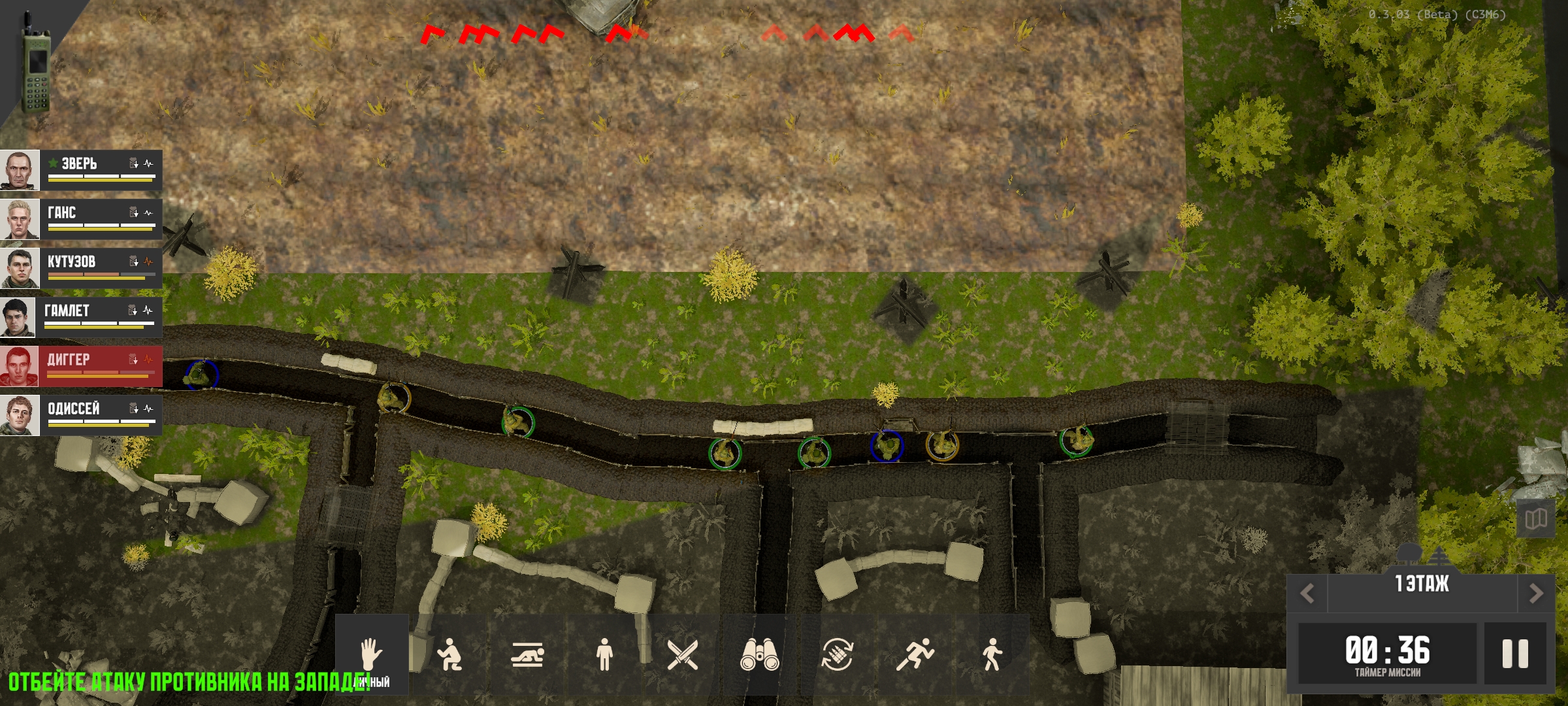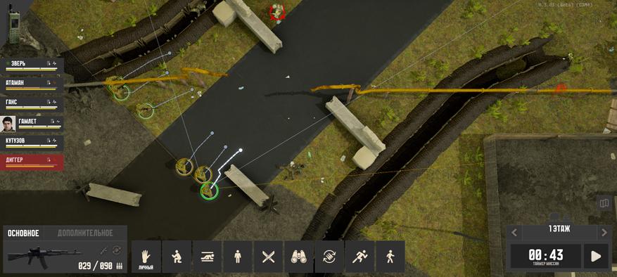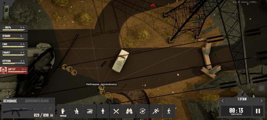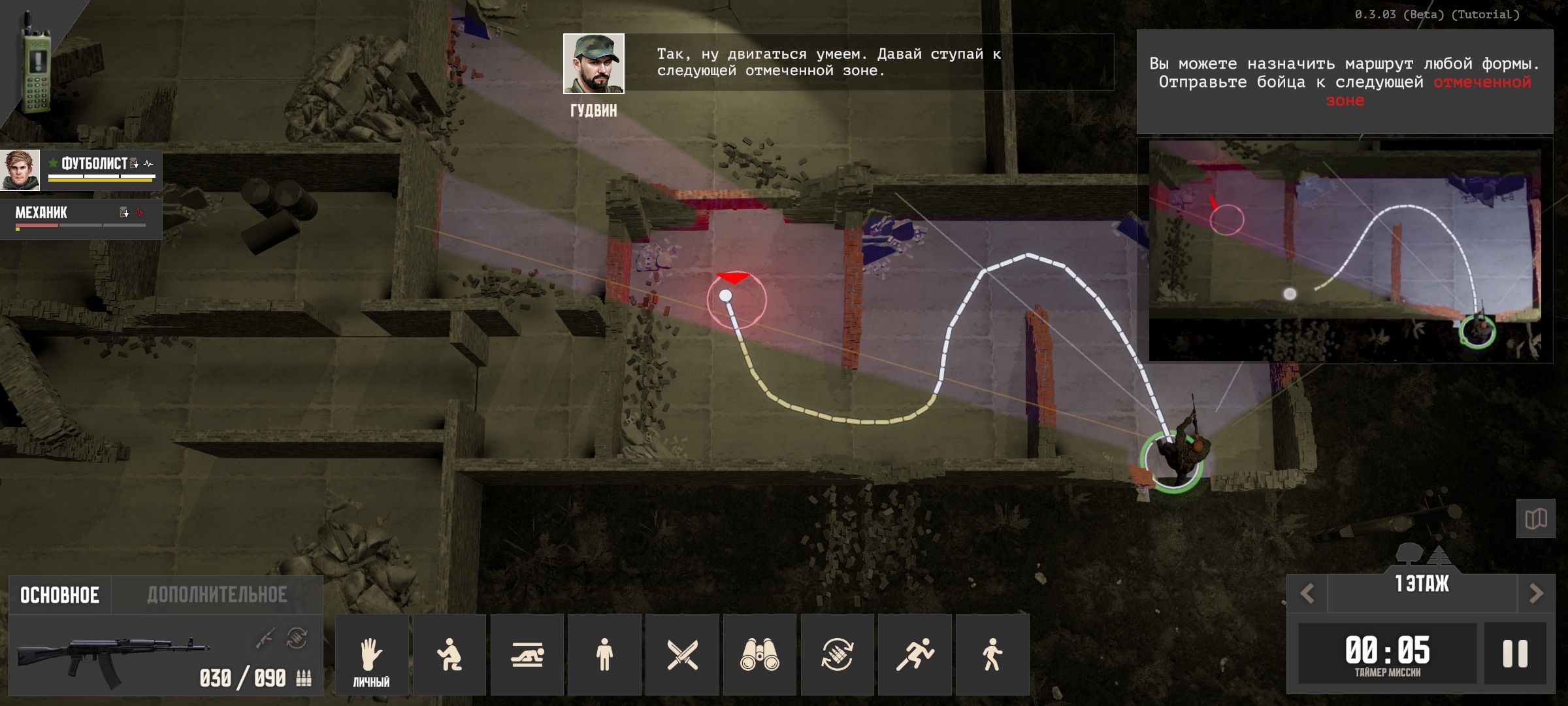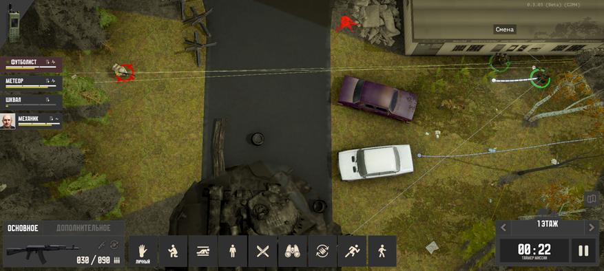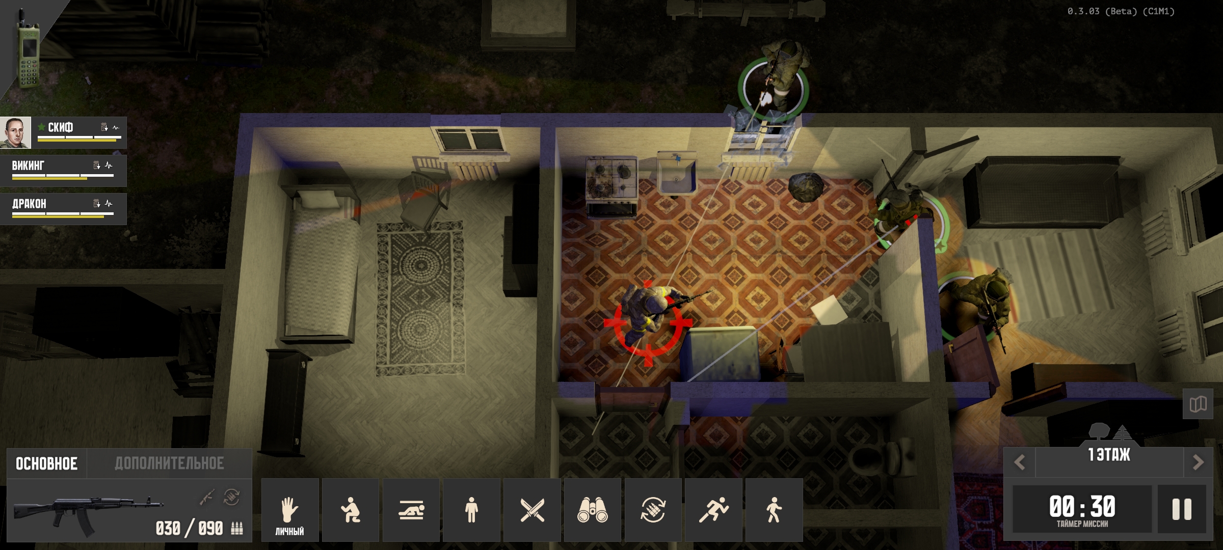 Боевая система построена по принципу Door Kickers. Мы не выбираем бойцу цель стрельбы. Мы направляем его угол обзора и ставим одну из двух команд: стрельба первым либо стрельба в ответ (разведка). Есть ещё дополнительные команды, типа огня на подавление или, допустим, броска гранаты. Но главный принцип это не меняет. Угол обзора автоматически настраивается либо в направлении движения, либо в направлении вражеского обстрела. Угол обзора в ручном режиме выбирается в расширенном меню команд нажатием на значок глаза. Важно, что при нажатии на данную команду, игра отображает нам только четыре направления четырьмя глазиками вокруг персонажа. Но по факту мы выбираем любое интересующее нас направление. То есть боец может бежать вперёд, а смотреть при этом хоть позади себя, хоть в сторону под любым нужным нам углом. Игрища с выставление угла обзора — важнейшая механика всей игры.