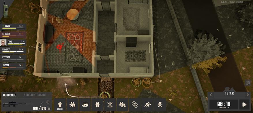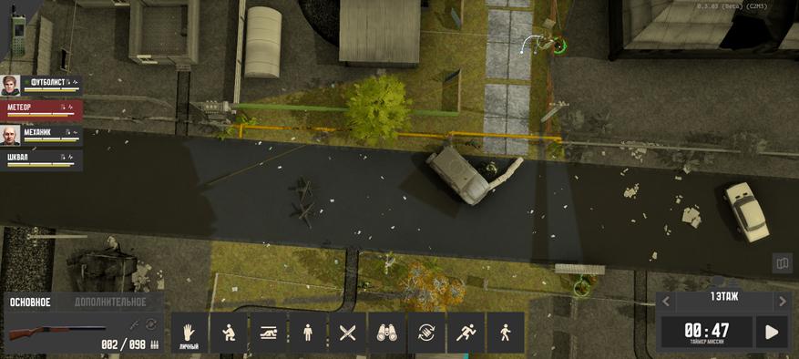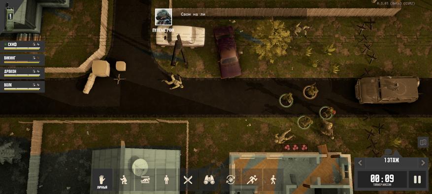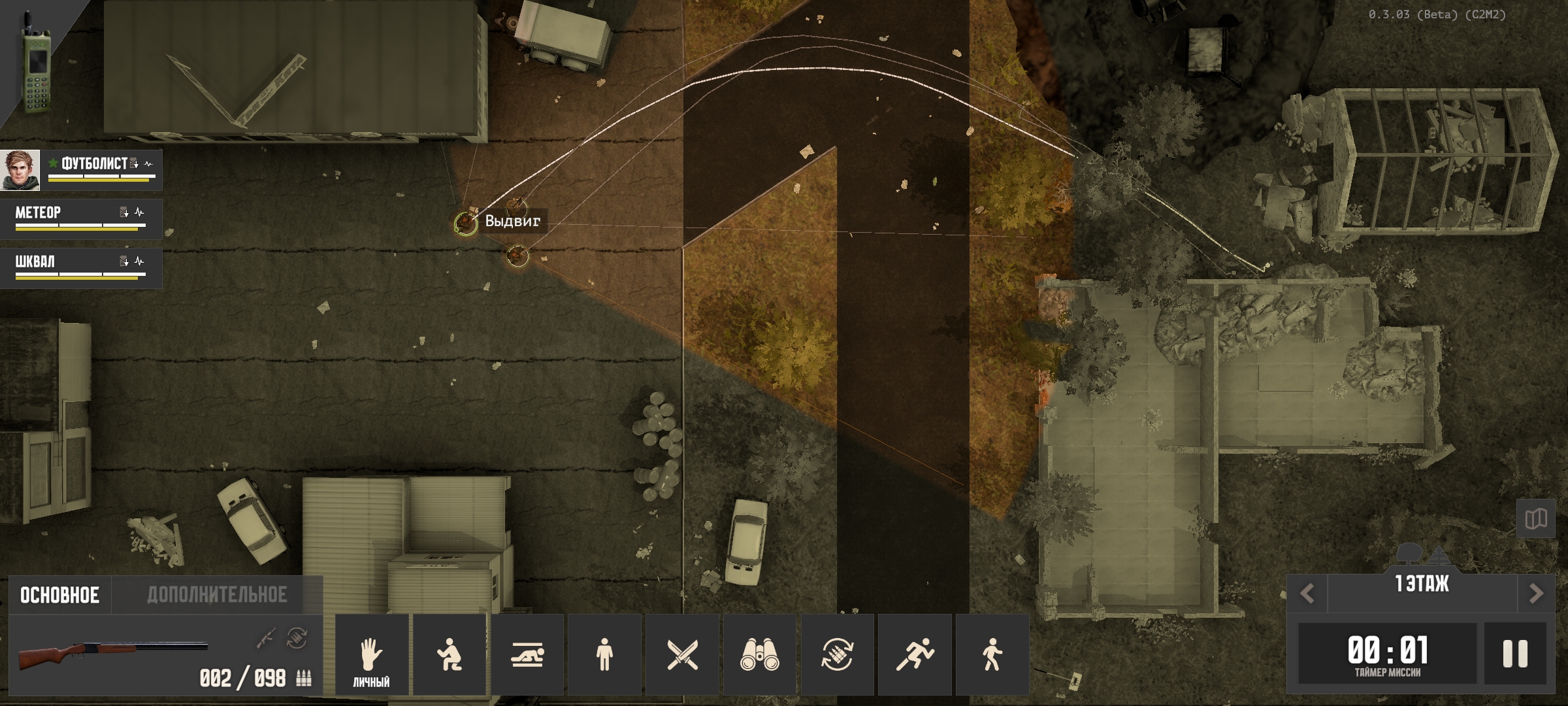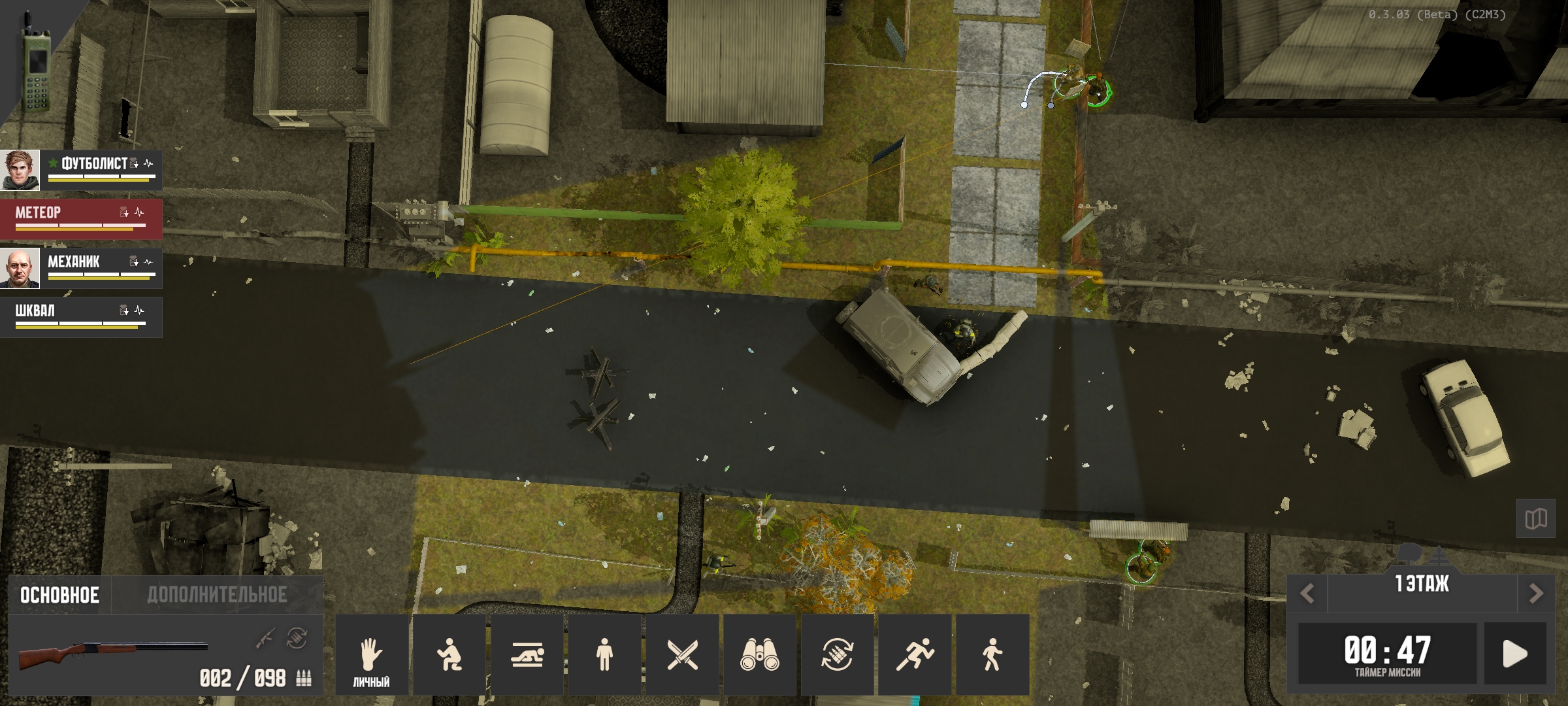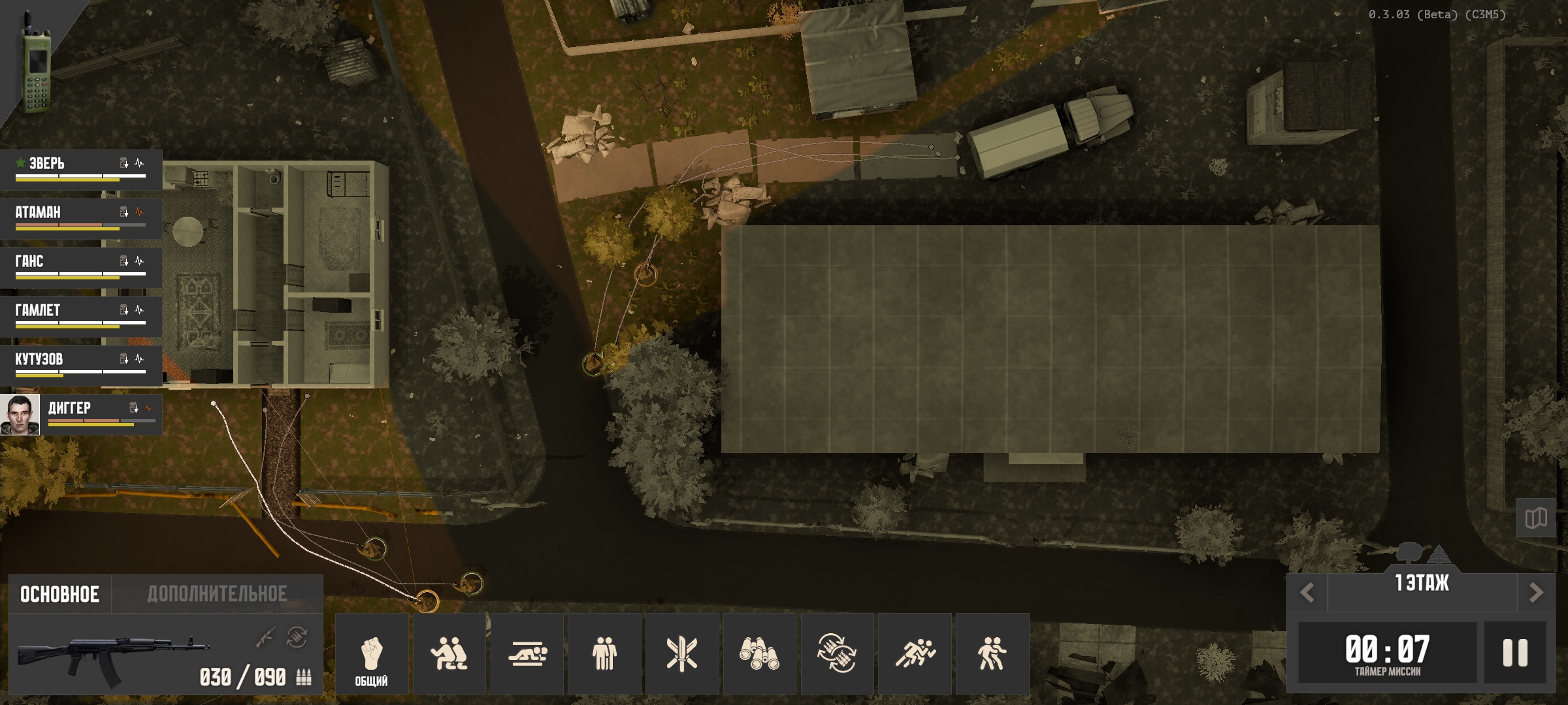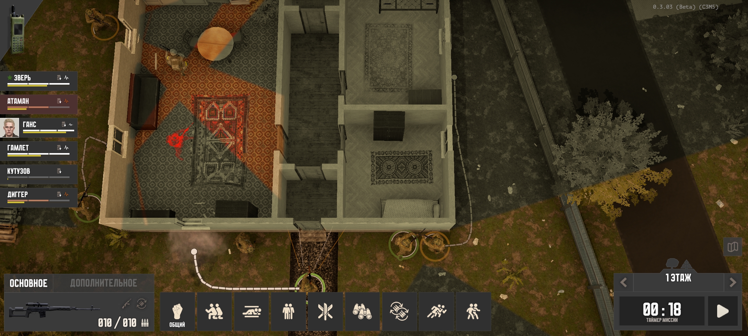 Боевая система построена по принципу Door Kickers. Мы не выбираем бойцу цель стрельбы. Мы направляем его угол обзора и ставим одну из двух команд: стрельба первым либо стрельба в ответ (разведка). Есть ещё дополнительные команды, типа огня на подавление или, допустим, броска гранаты. Но главный принцип это не меняет. Угол обзора автоматически настраивается либо в направлении движения, либо в направлении вражеского обстрела. Угол обзора в ручном режиме выбирается в расширенном меню команд нажатием на значок глаза. Важно, что при нажатии на данную команду, игра отображает нам только четыре направления четырьмя глазиками вокруг персонажа. Но по факту мы выбираем любое интересующее нас направление. То есть боец может бежать вперёд, а смотреть при этом хоть позади себя, хоть в сторону под любым нужным нам углом. Игрища с выставление угла обзора — важнейшая механика всей игры.