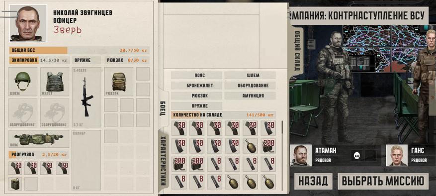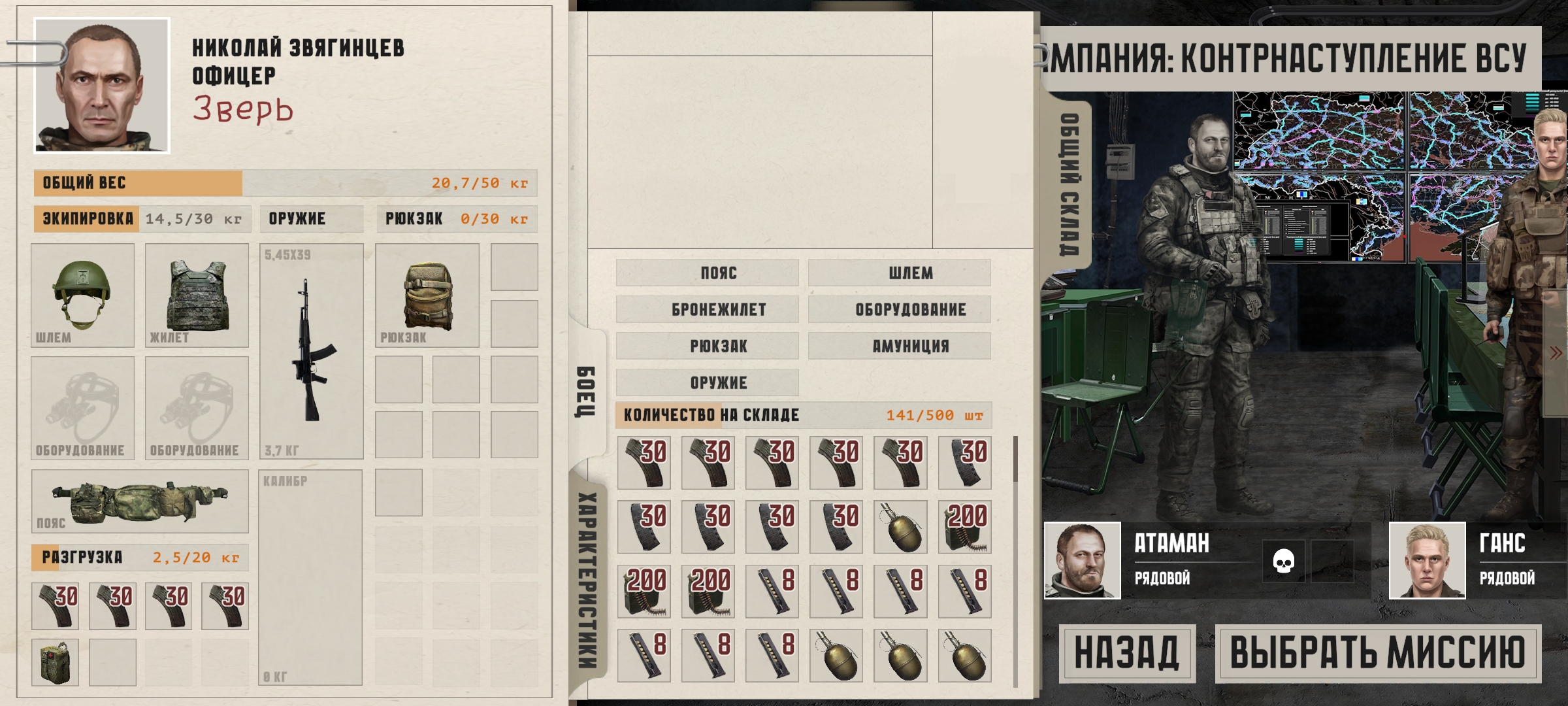 Подготовка к выполнению задания начинается с экипировки бойцов. Экипировать их можно разово на всю кампанию, либо пересматривать снаряжение перед каждым заданием по желанию. То есть постоянно копаться в инвентаре не обязательно, что радует. Для всех бойцов доступен единый склад, который постепенно, по мере прохождения пополняется новым снаряжением. Подбираем мы команде пояса под разгрузку, рюкзаки под запас (лично я не использовал, разгрузки хватало), бронежилеты, оружие, шлемы, оборудование, типа ночного видения, амуницию, то есть патроны, аптечки, гранаты. У каждого воина есть характеристики стрельбы, по которым легко понять, каким оружием и патронами лучше его снабжать. Менеджмент несложный, удобный, быстрый. Не забываем учитывать вес. Далее нам описывают задачу, условия победы и поражения. Этап подготовки в игре выполнен качественно и понятно.