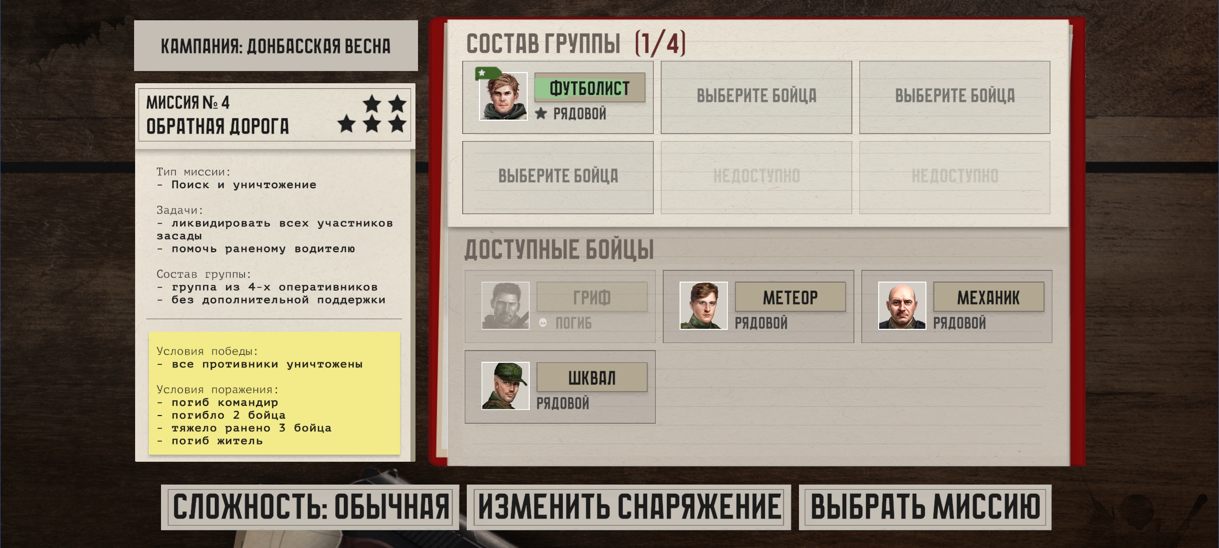 В бесплатном демо у нас есть доступ к двум кампаниям: «Донбасская весна» и «Битва за Мариуполь». Миссии открываются нам поочерёдно. На начало игры доступно только две из двадцати миссий, по одной на каждую кампанию. В идеале в эти первые две миссии разработчикам стоило также ввести обучение в качестве закрепления и разъяснения нюансов, чего к сожалению нет. Первая миссия «Битвы за Мариуполь» по зачистке дома выполнена отлично, как и начало первой миссии «Донбасской весны» по зачистке трёх домов. Однако важно понимать, что геймплей там выведен на максимум. На фоне очень лайтового обучения эти простые, по сути, задачи могут конкретно подорвать пятую точку. При этом главной проблемой первой миссии лично для меня оказался укреплённый блокпост кампании «Донбасская весна», который меня попросту сломал, о чём расскажу отдельно.