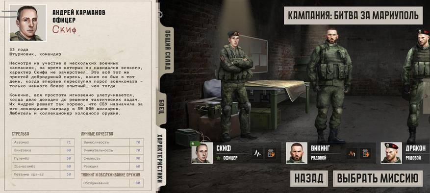 Сюжетно игра в заставках — это чистый политпросвет, а в ходе миссий — генератор квестов. Тут есть событийность, последовательность, персонажи с харизмой, прописанной буквами в меню характеристик. Разработчики при информационной поддержке Вооружённых Сил Российской Федерации короткими очерками миссий показывают взгляд на события текущего конфликта. Происходящее на экране привязано к годам, что даёт повод самостоятельно почитать дополнительно на имеющихся информационных ресурсах тем, кто не в курсе и кто ещё не читал. Творцы выбрали острую и актуальную тематику, что в играх встретишь не часто. Обычно в подобных проектах в качестве сеттинга берут либо вымышленные, либо события минувших лет, а не действующий боевой конфликт в его разгаре. Но авторы в своём праве. И, например, Steam не нашёл оснований не выпускать данную игру на площадке цифрового магазина, что является хорошим показателем.