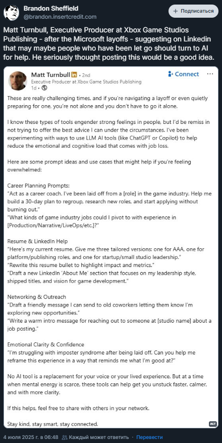 Затем Мэтт предлагает использовать LLM (например, ChatGPT или Copilot), чтобы помочь справиться с эмоциональным и когнитивным напряжением, которое возникает при потере работы". Затем он приводит ряд рекомендаций для людей, которые испытывают трудности после увольнения.