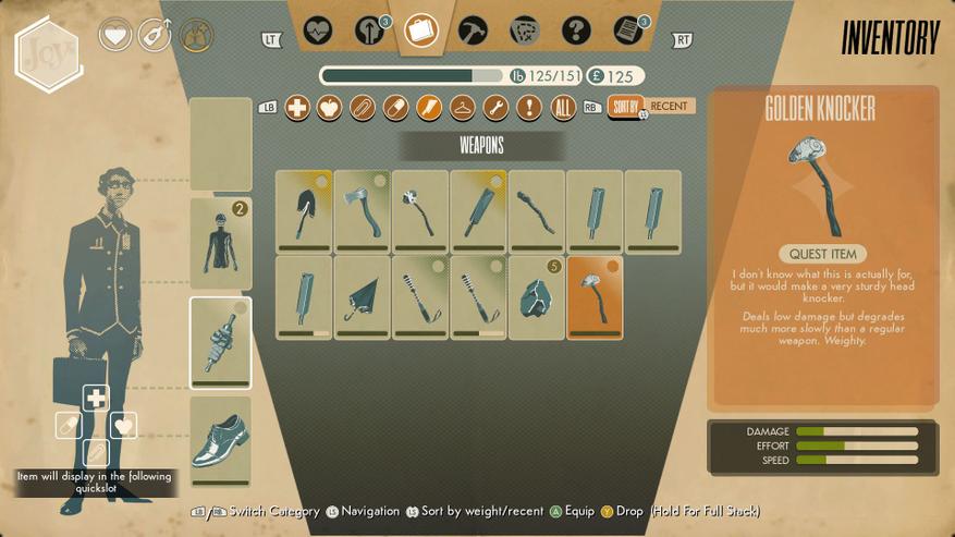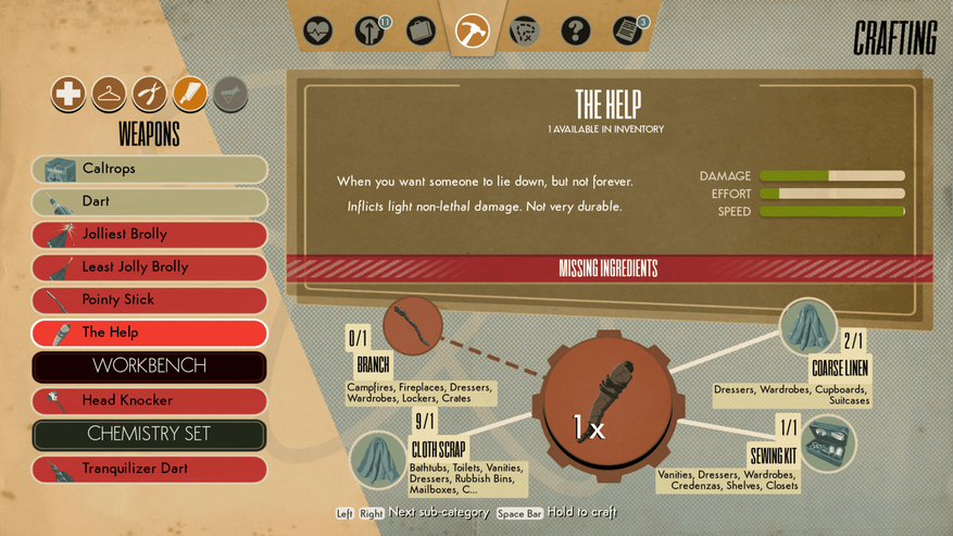 Крафт состоит в том, чтобы ходить по миру и собирать кучу вещей и хлама, которые вы, вероятно, никогда не будете использовать для создания вещей, для которых вы скорее всего никогда не получите рецепт. Если вы пытаетесь быть пацифистом, то будете отчаянно искать один из трех рецептов несмертельного оружия для изготовления, но всегда можно подобрать кучу оружия с тел местных жителей или местной полиции. Вдобавок ко всему, вы будете создавать инструменты, лечебные бальзамы, отмычки, бинты и солнечный свет (безвредный аналог радостина). Это все, для чего на самом деле используется система крафта. И к концу игры у вас по-прежнему может оставаться куча хлама в инвентаре при неимении достаточного количества рецептов для эксплуатации материалов, даже при условии выполнения всех квестов.