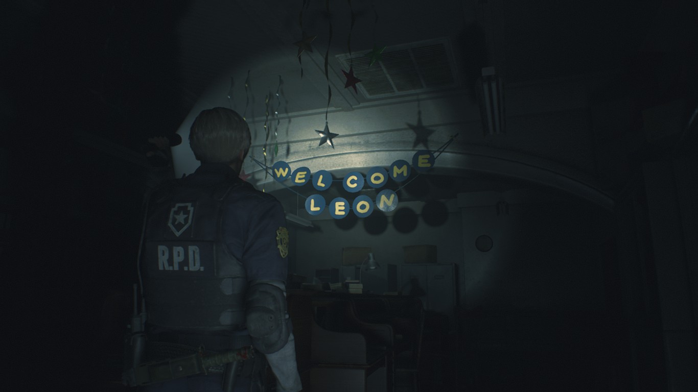 В ремейке игры, на этой же локации висит надпись с приветствием Леона и явно одной пропущенной буквой. Которую можно найти на одном из столов в полицейском участке. Видимо разработчики спихнули всю ответственность за опечатку на неграмотных офицеров.