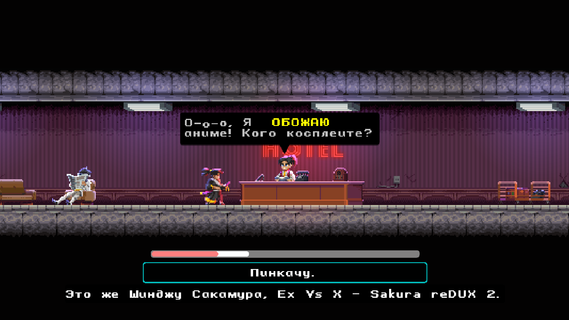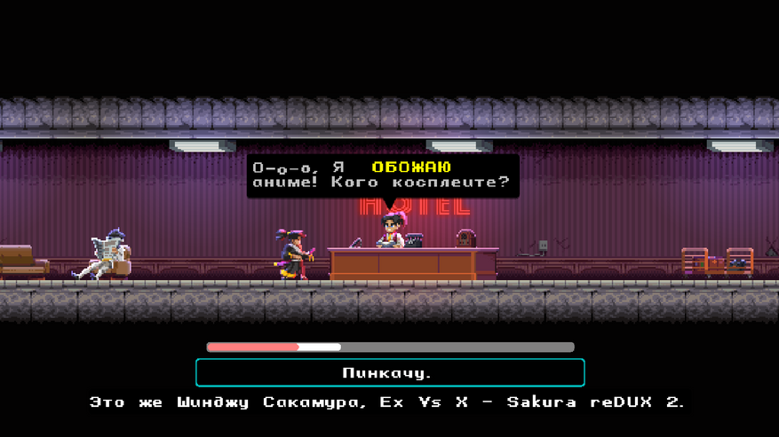 Ну, а закончить я хочу цитатой из игры Katana ZERO. О-о-о, Я обожаю аниме! Кого косплеите?