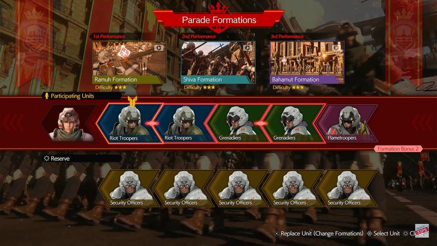 В 4 главе сюжетной кампании вам необходимо принять участие в параде. Чтобы получить + к отношениям с Тифой после завершения парада, необходимо собрать полный состав своего полка и разместить пехотинцев таким образом, чтобы сложность каждой формации достигла трех звёзд, после чего успешно завершить мини-игру.