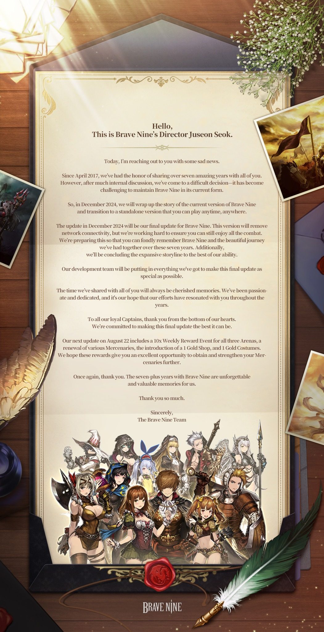 Разработчики обещают сохранить в грядущей оффлайн-версии возможность принимать участие в сражениях. Декабрьское обновление поставит точку в сюжетной составляющей Brave Nine, и станет «настолько особенным, насколько это возможно».